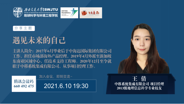 主讲人简介:王倩,女,25岁,中共党员,2013级地理信息科学专业毕业生。2017年6月毕业后于中海达国际集团有限公司工作,担任市场部海外产品经理,2019年4月外派至新加坡东南亚区域中心,任技术支持工程师。2020年12月至今就职于中移系统集成有限公司,从事项目经理工作。