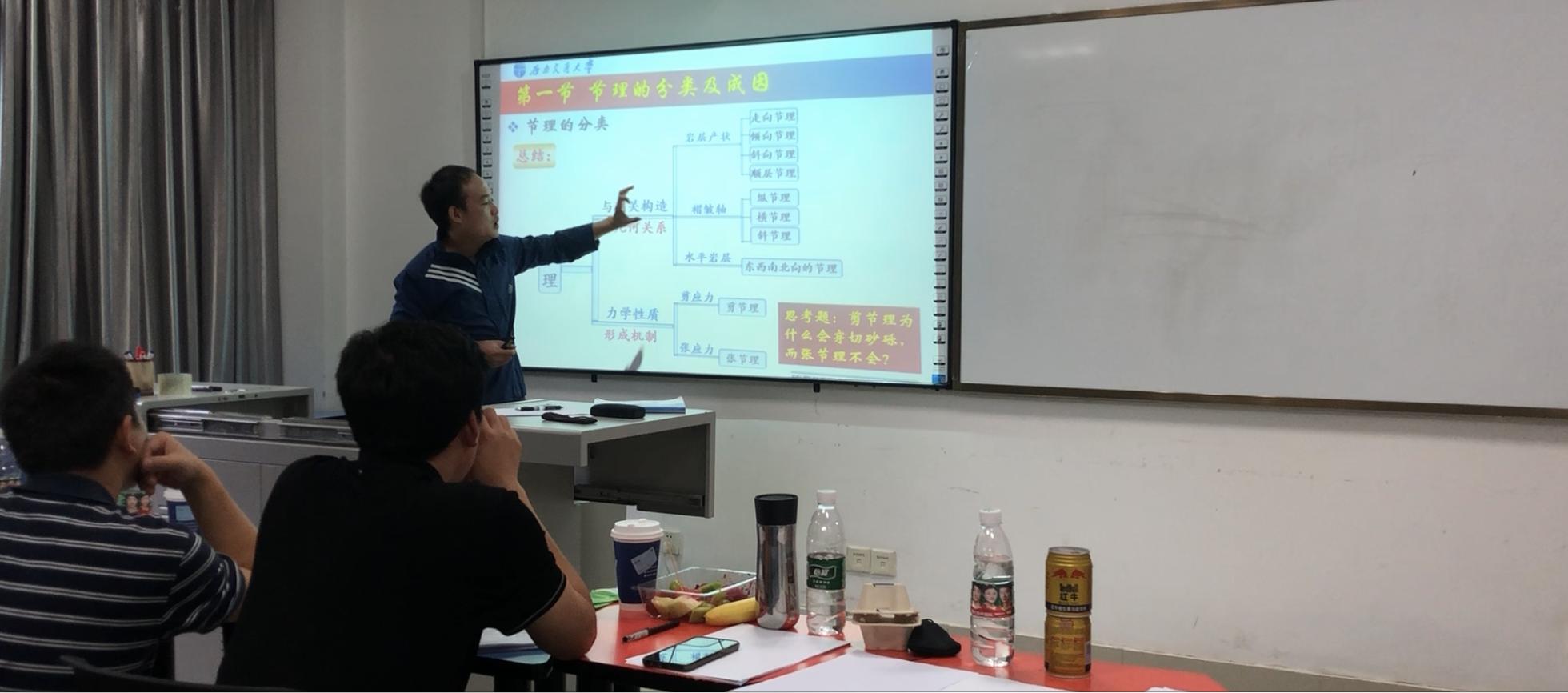 王虎老师主讲《构造地质学》,他重点讲解了节理方面的知识点,评委老师评价该讲课过程较为自信,还可以借鉴国内外精品课程和相关教材进一步精美化课件、优化板书细节等,最后程谦恭教授示范了构造知识点的讲解细节。