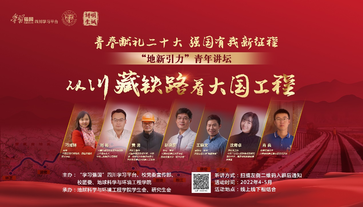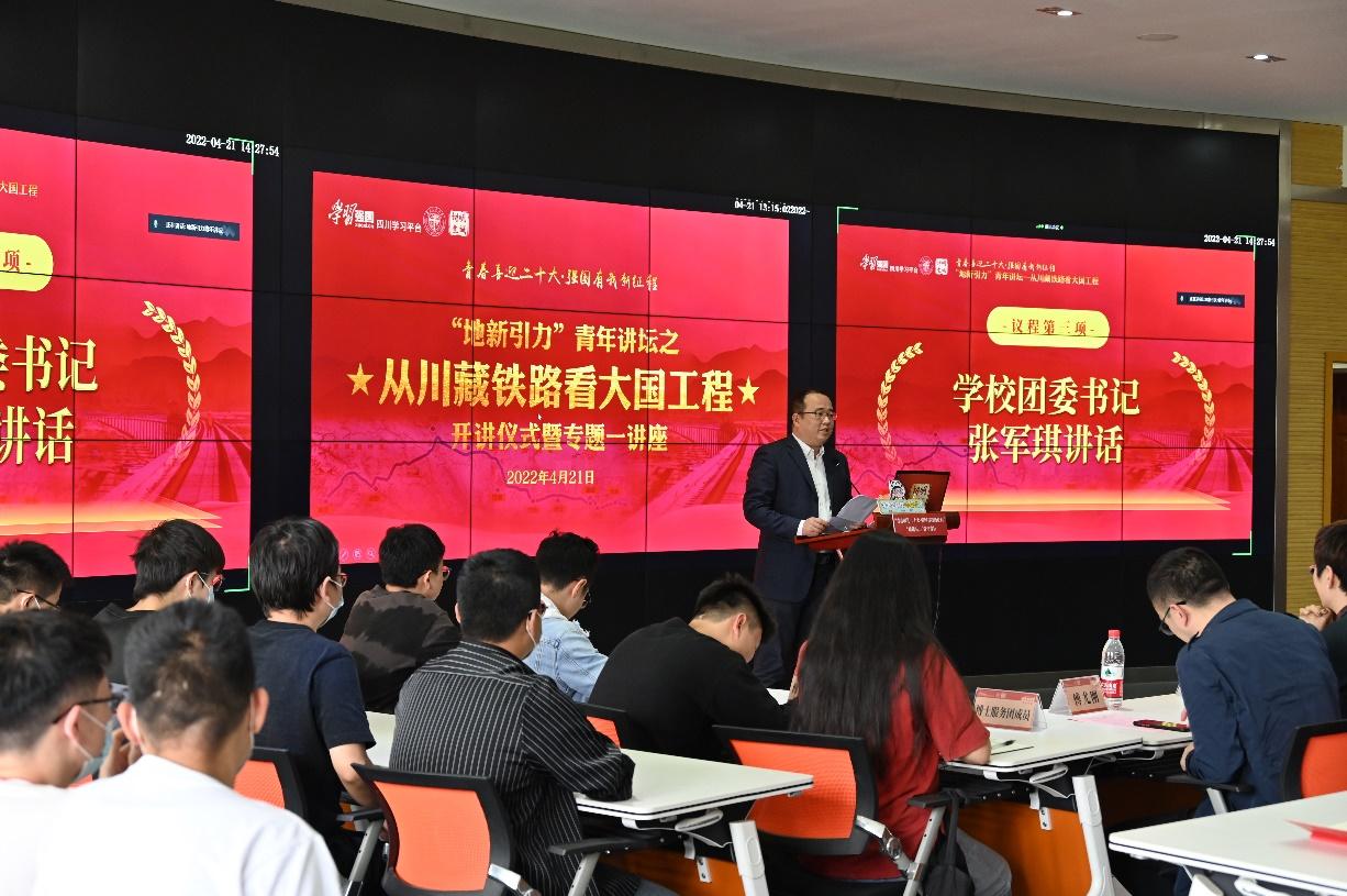 地球科学与环境工程学院承办的“青春献礼二十大,强国有我新征程‘地新引力’青年讲坛之从川藏铁路看大国工程”系列讲座开讲仪式暨专题一讲座于4月21日下午在X4243顺利举行。“学习强国”四川学习平台编辑中心副主任余东、地学学院党委书记关秦川、校团委书记张军琪、党委宣传部副部长颉芳、地学学院副院长赵晓彦、地学学院党委副书记傅尤刚参加开讲仪式,线下线上本硕博学生共计600余人听讲。会议由地学学院团委书记杨都强主持。