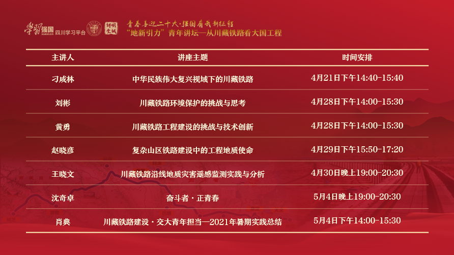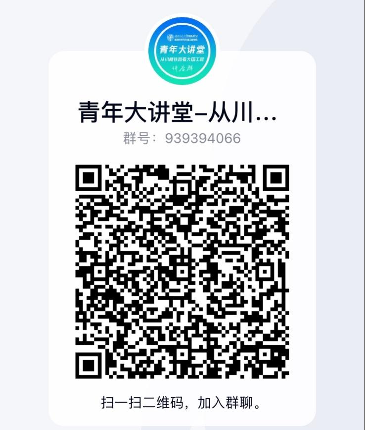 据悉,“青春献礼二十大,强国有我新征程‘地新引力’青年讲坛之从川藏铁路看大国工程”系列讲座将在4月-5月持续推出,后续将邀请到黄勇(高级工程师,川藏铁路副总设计师,中铁第一勘察设计院集团有限公司地质路基设计院副总工程师)等嘉宾开讲。最新讲座安排将在讲座群通知,有意参与的同学可扫码入群(目前群内已有600余名JVID