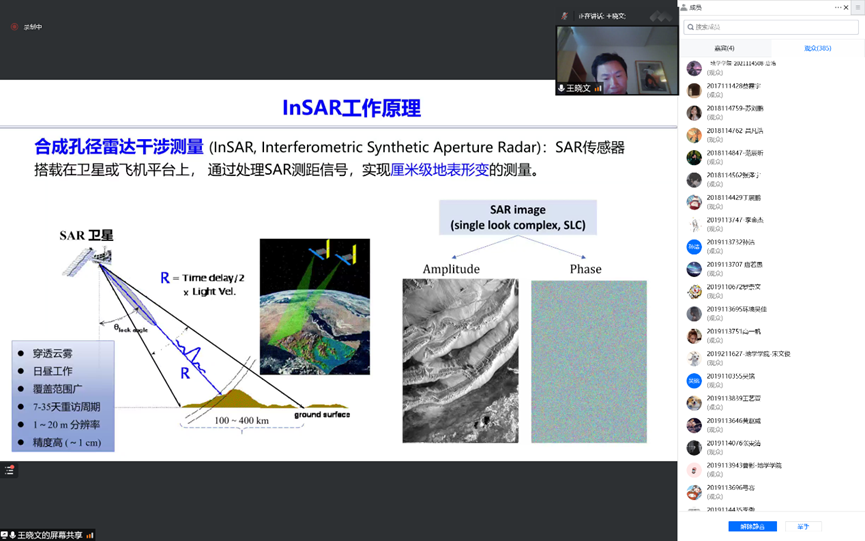 紧接着在第三、第四部分中,王晓文又以金沙江沿岸以及藏东南冰川两处作为实际案例,依托工程实际情况向学生展示了InSAR技术的实际工作流程以及得到的成果,充分展示了我国科研学者在面对难题时积极探索解决方法,持续开拓创新的能力。