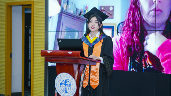 毕业生代表董雯雯回忆了自己大学生活的难忘点滴,她表示,在学校难忘的经历成就了更好的自己,并真挚表达了对于同学、家人、各位辛勤付出的老师们以及该项目所有工作人员的感谢,勉励同学们这次毕业并不是结束,而是一段新的开始,希望同学们迈步前进,拥抱属于自己的新天地。