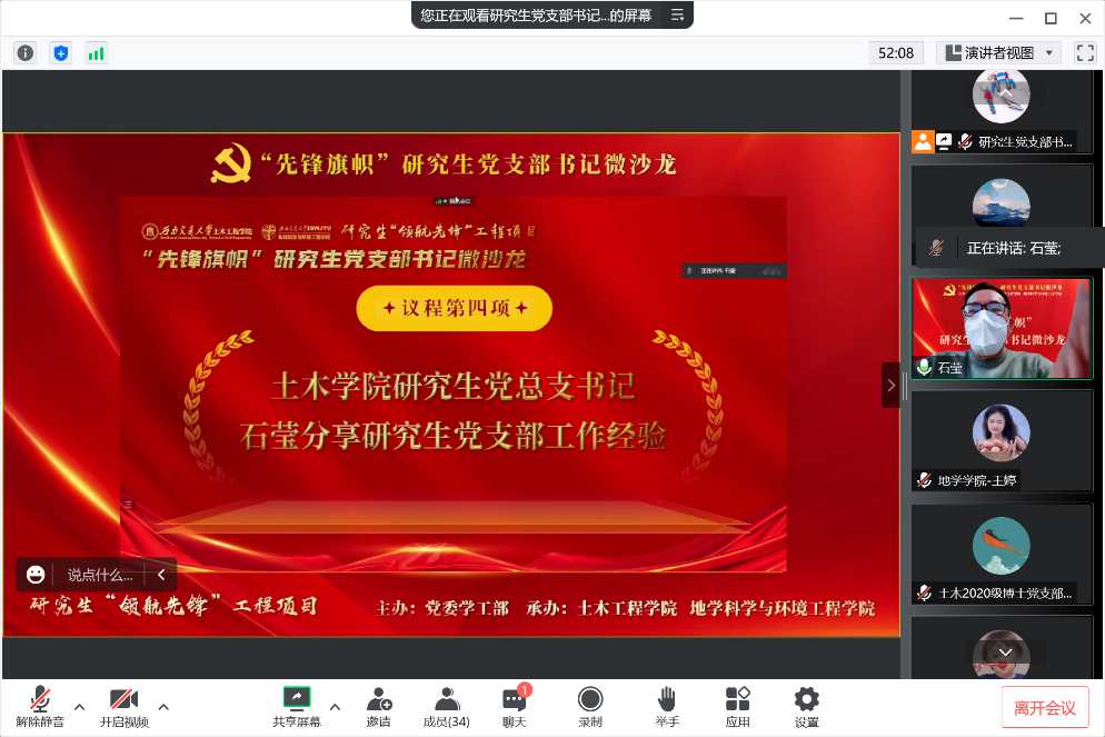 紧接着,土木学院研究生党总支书记石莹分享了研究生党支部工作经验,石莹指出树立党员的角色意识是支部建设中的重要一环,是增强党支部凝聚力的内在动力。一方面,他强调支部党员应立足“两个大局”,在各类具体的微观言行中显现出先锋意识,在日常生活中要做好安全稳定、思想引领工作,另一方面,他指出研究生支部党日活动要充分结合专业特色、科研攻关任务来开展,充分发挥党员的先锋作用,将支部党员培养为德才兼备的高素质人才。