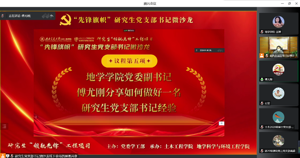 为深入学习贯彻落实党的二十大精神,积极发挥党支部书记的“领头羊”作用,共同学习探索更加高效和高质量的党支部工作思路与方法,地学学院党委联合土木学院党委于2022年12月13日通过线上的方式举办研究生党支部书记微沙龙活动,旨在以沙龙座谈交流的形式促进跨学院党支部共学共享,提供学生党支部书记交流平台,深入探讨研究生支部建设以及党员教育、管理的“疑难杂症”,提升党支部书记的政治素养与业务能力。本次活动邀请了地学学院党委副书记傅尤刚、土木学院研究生党总支书记石莹、土木学院研究生辅导员强博文,活动由地学学院学生党建负责老师文强主持,地学学院及土木学院研究生党支部书记代表参加。