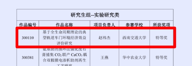 大赛共吸引了全国200余所高校参加,并最终从提交的1000余份作品中评选出特等奖22项,一等奖60项、二等奖120项、三等奖157项。地学学院学生赵祎杰荣获研究生组实验研究类特等奖,获奖作品为《基于全生命周期理论的典型轨道车门环境经济效益评价研究》。