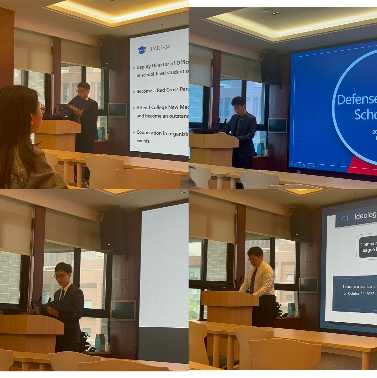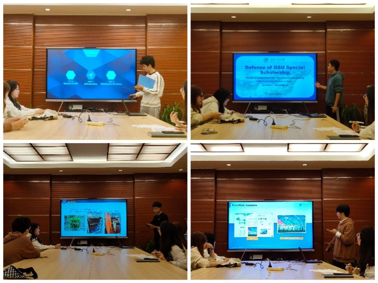 本次评选展示答辩会包括个人陈述和评审总结两个环节进行,与会评审老师预审审阅所有答辩同学的相关材料,严格按照评奖细则进行核查。答辩环节,申请答辩的同学采用全英文答辩的形式,分别从思想品德、学习成绩、学科竞赛、文体活动、社会实践和志愿服务等多个方面分享了自己的成长历程和收获。