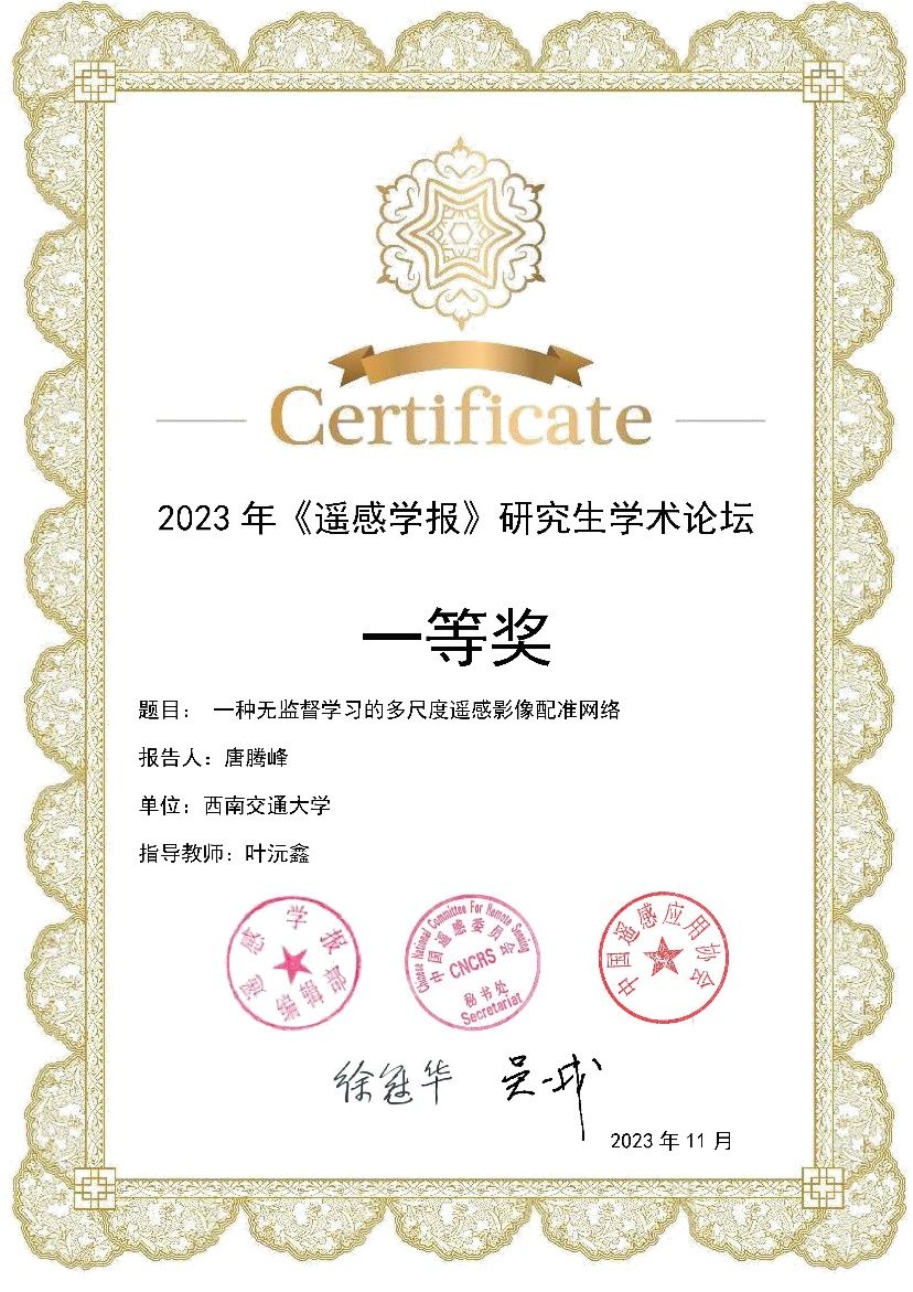 地球科学与环境工程学院2023级博士生唐腾峰在该论坛分享了题目为《一种无监督学习的多尺度遥感影像配准网络》的研究报告,并获得该论坛的一等奖,指导老师为叶沅鑫教授。