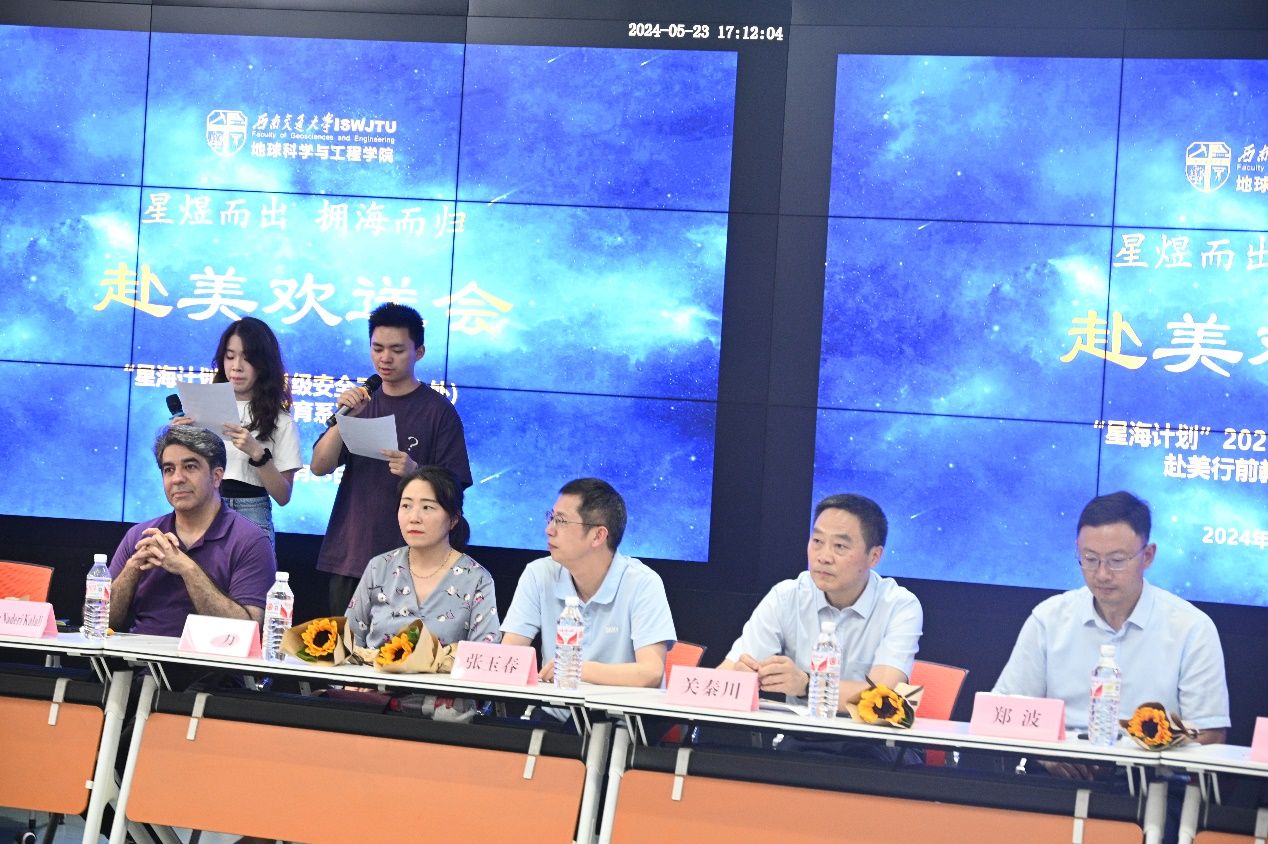 犀浦校区隆重举行。2024年5月23日晚7点,“星海计划”2021级安全工程(中外)赴美行前教育系列活动之“星煜而出,拥海而归”学生赴美欢送会在X4243举行。地学学院党委书记关秦川、党委副书记郑波、副院长张玉春、合作办学项目行政主管关方、专任教师Ehsan Naderi Kalali、辅导员梁爽以及21级安全工程(中外)全体同学参与本次活动。本次欢送会由21级安全工程(中外)专业学生李瑞、李思颖共同主持。
