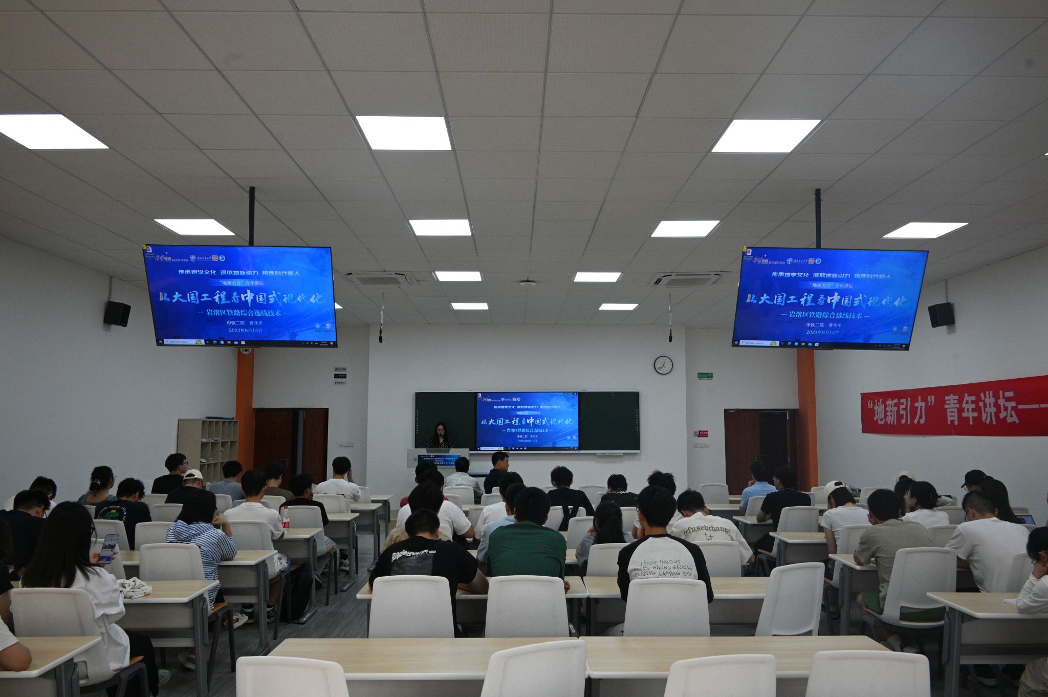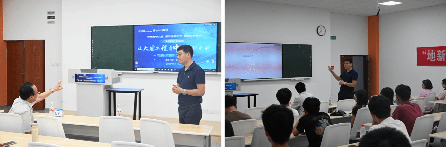 在四号教学楼X4247教室隆重举办了“从大国工程看中国式现代化”专题五讲座。本次讲座聚焦岩溶区铁路综合选线技术,邀请了业内知名专家中铁二院教授级高工曹化平作为主讲人,讲座由地学学院团委副书记李婧主持,副院长赵晓彦出席本次活动,智慧、地学、环境等学院60余名学生参与本次讲座。