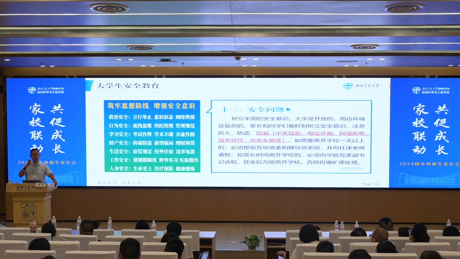 随后,郑书记从学生的学业规划、日常管理以及安全教育三个方面给予新生家长一些参考和指导。学业规划方面,重点阐述了学生成绩构成、毕业学分等学业硬性要求,同时郑书记也鼓励学生在完成学业的同时,积极参与到学校的社团活动、体育运动以及科创竞赛之中。除此之外,在保研、转专业、未来就业方向等关注度较高的问题上也做出了解答,让家长能够对学生所在的专业以及发展方向有更清晰的了解。