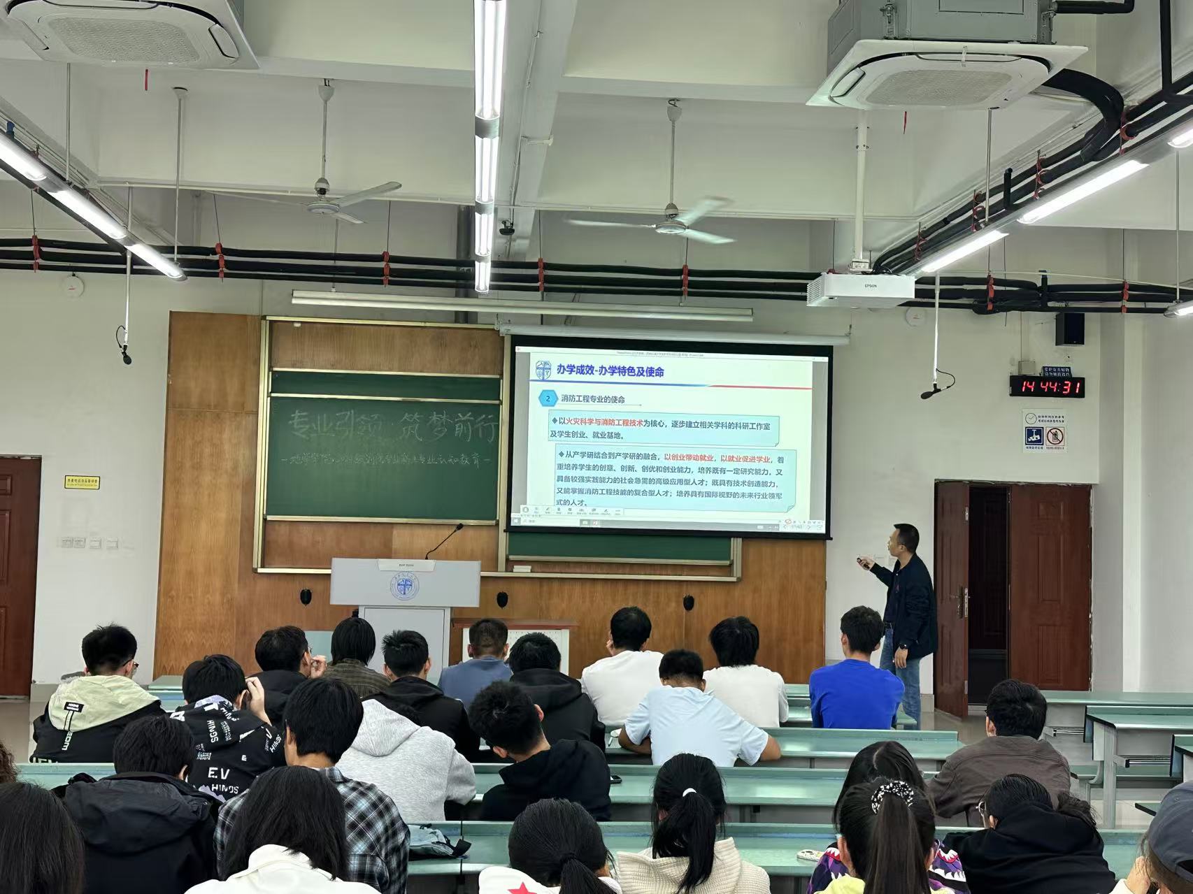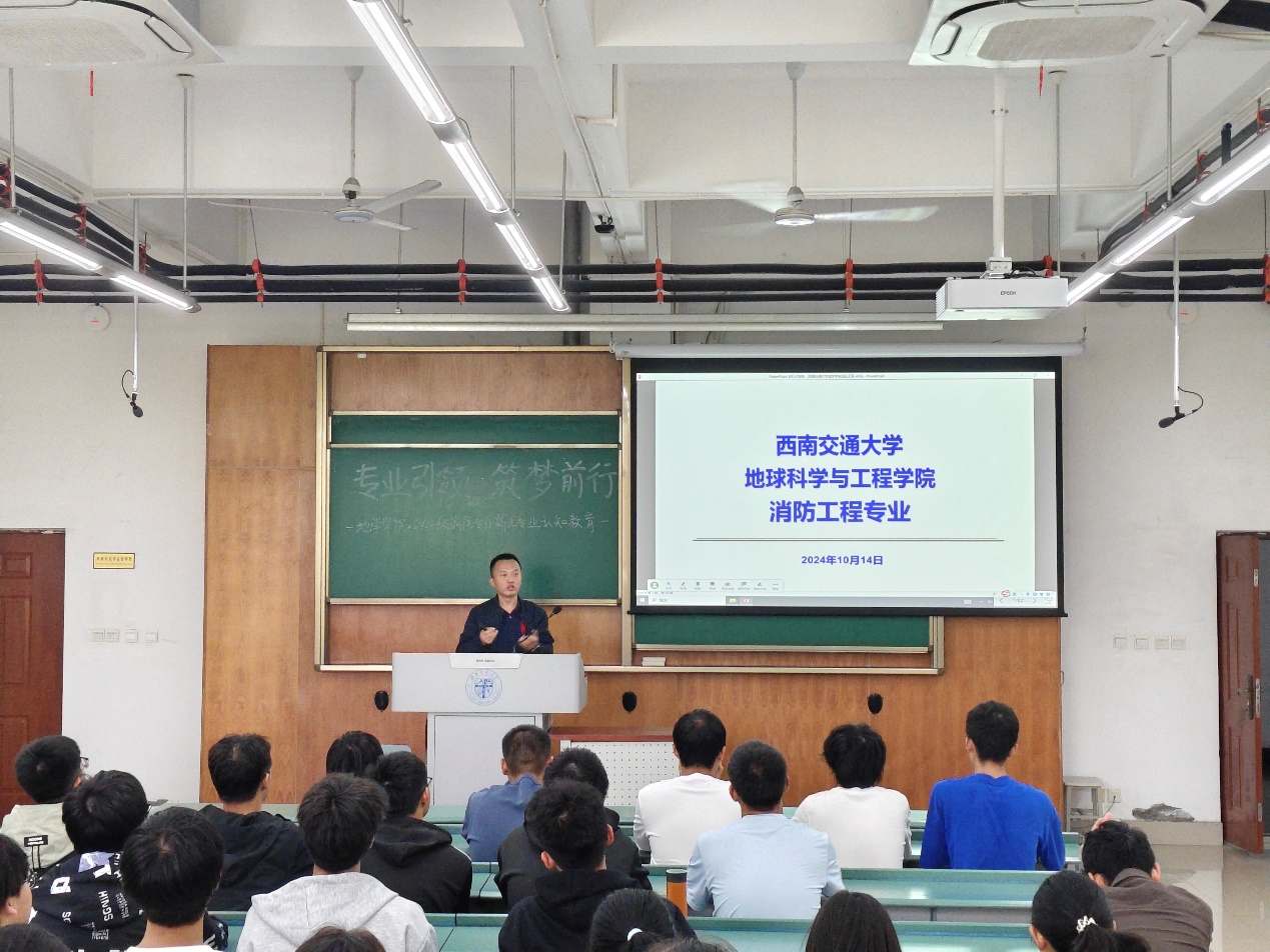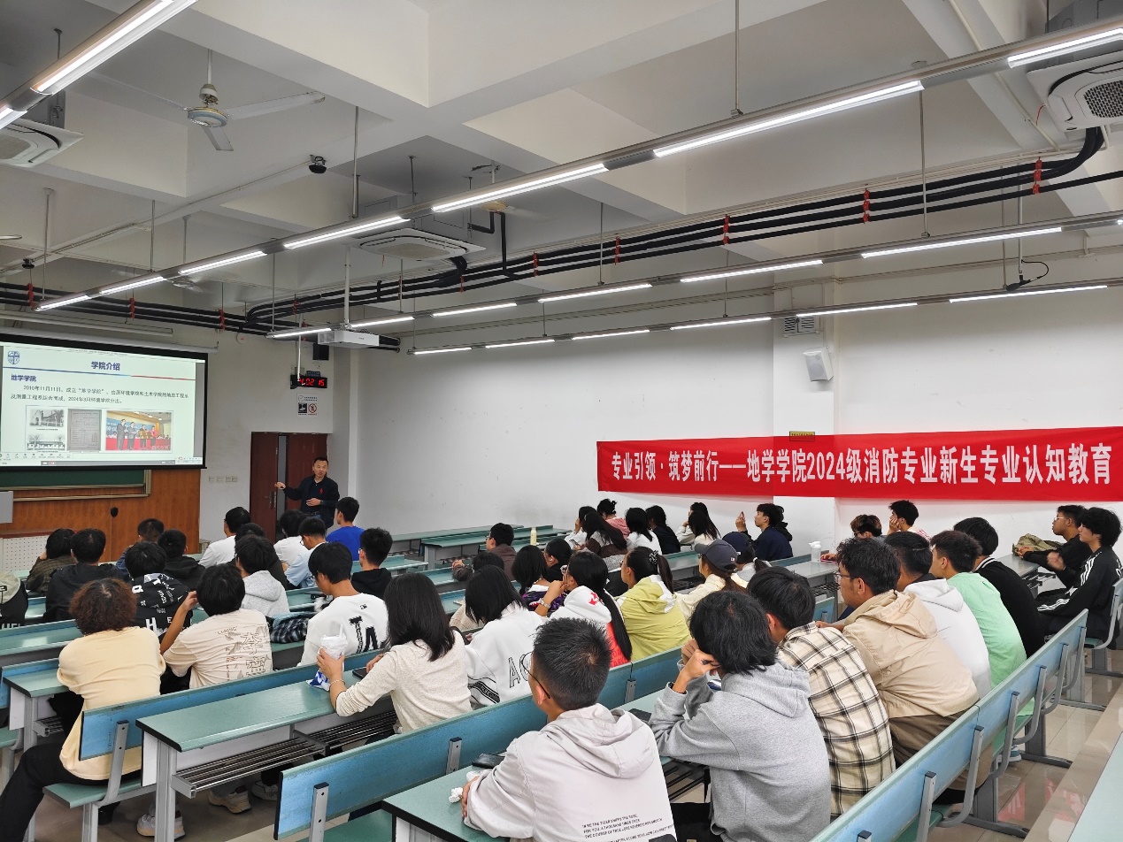 在X4153成功举办了消防工程专业认知教育大会。本次大会由地学学院2024级本科辅导员姜茜主持,消防工程教师李涛主讲,2024级全体消防工程专业新生参加活动。