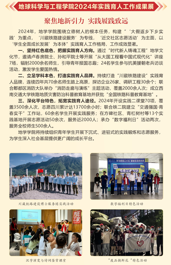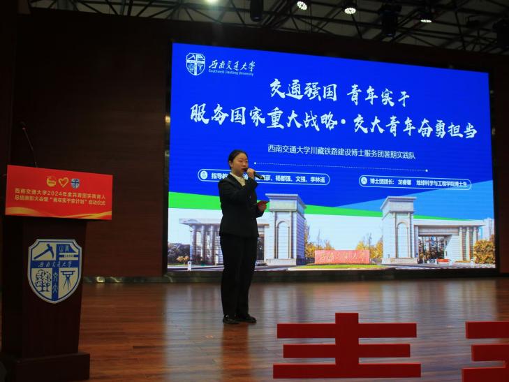 在大会上,学院的川藏铁路建设博士服务团作为优秀实践项目做分享交流。川藏铁路建设博士服务团第四次实践团团长、地学学院博士生龙睿馨作为代表进行了实践分享,讲述他们跨越3000公里,奔赴大国工程建设一线,“受教育、长才干、作贡献”的实践故事。