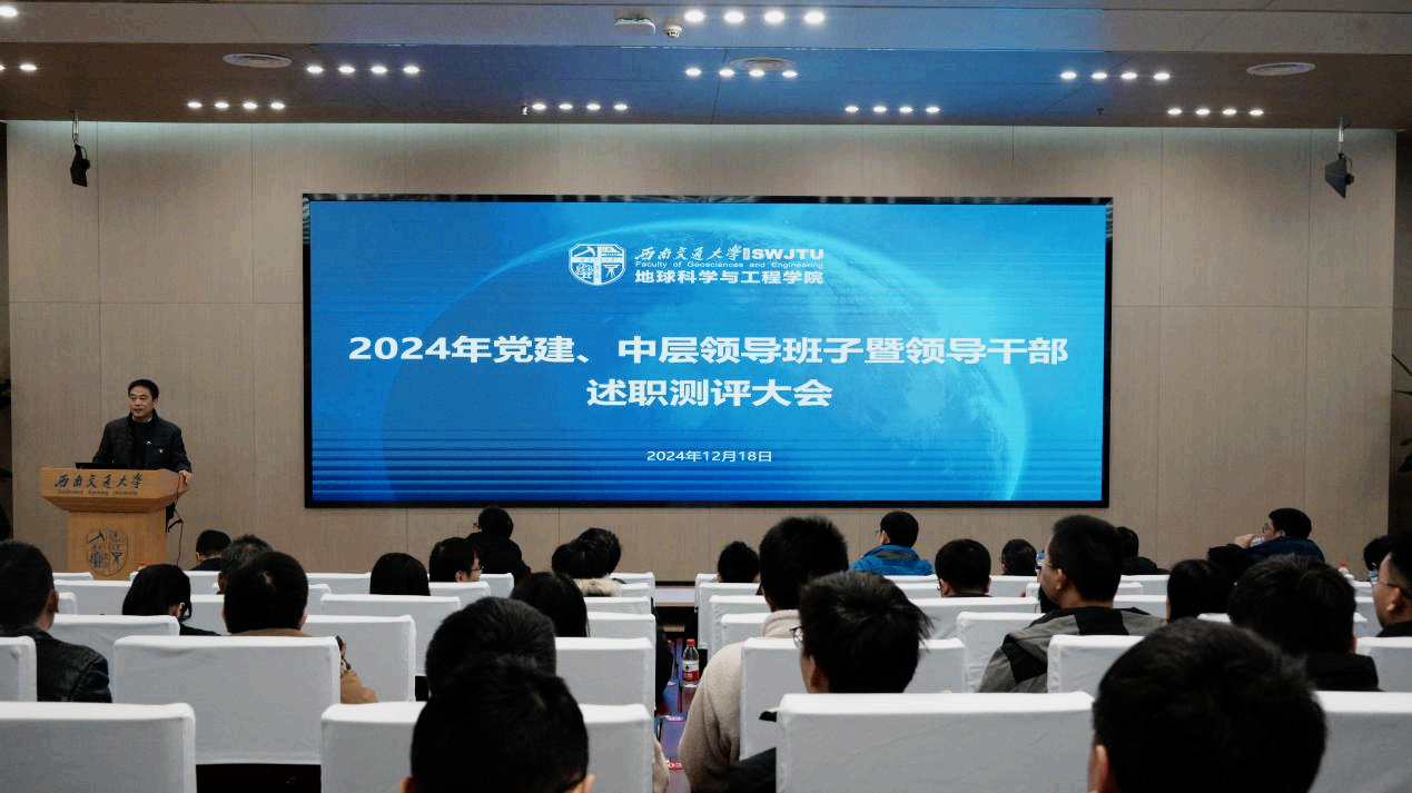 12月18日下午,地学学院2024年党建、中层领导班子暨领导干部述职测评大会在图书馆二号报告厅隆重召开。参加本次会议的有学院党委书记关秦川、院长刘国祥,党委副书记、纪委书记郑波,副院长朱军、赵晓彦、张玉春、高贵,以及学院其他教职工和学生党支部书记代表。会议由学院党委书记关秦川主持。党委组织部正处级组织员孔书祥同志代表学校党委莅临现场进行督导。