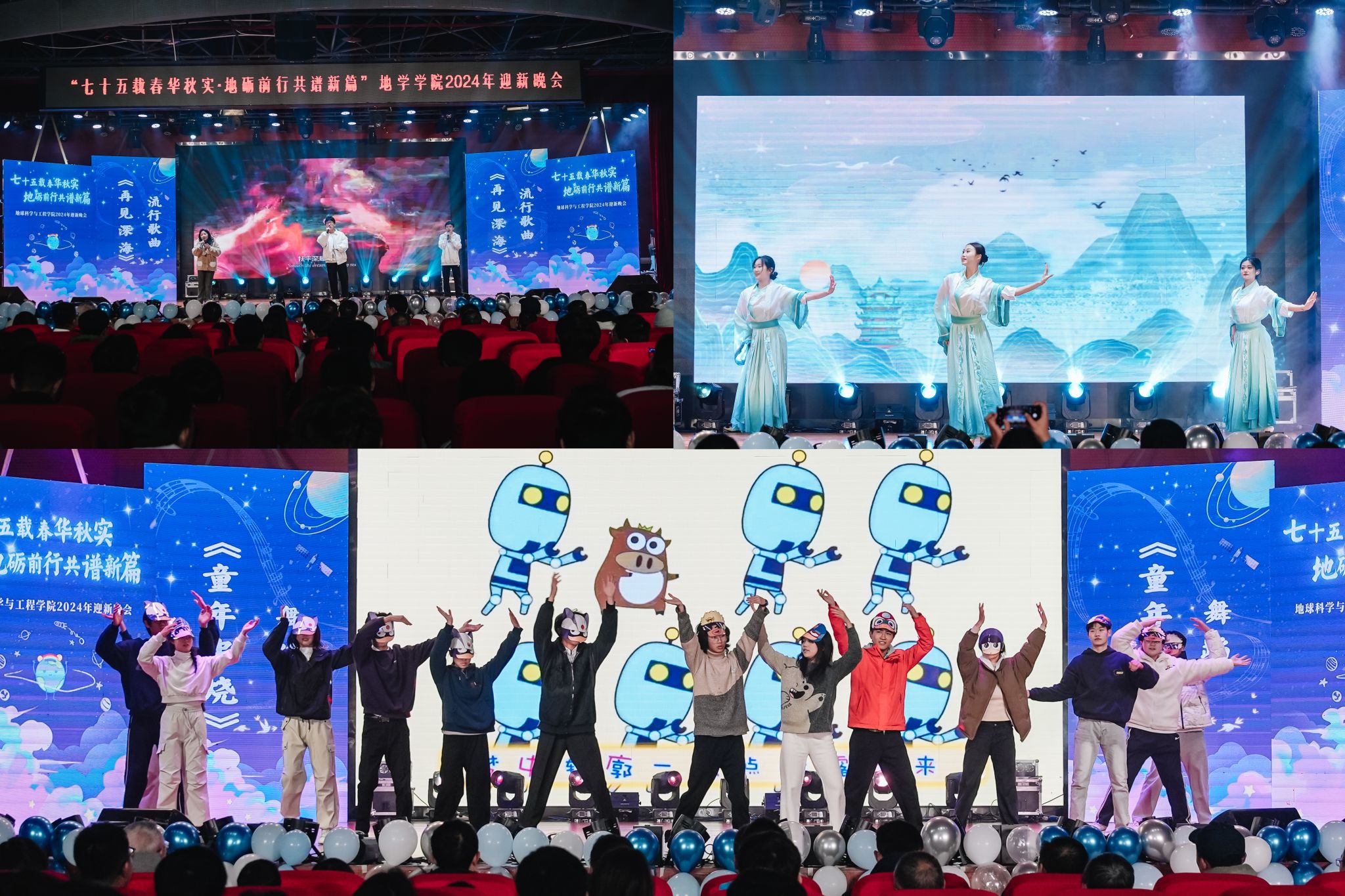 由地学青协、班联以及测绘2班带来的合唱《夜空中最亮的星》宛如璀璨星群在夜幕下共鸣,交织着希望与力量的歌声里有对梦想的执着与冲破黑暗的勇毅,动人心弦。