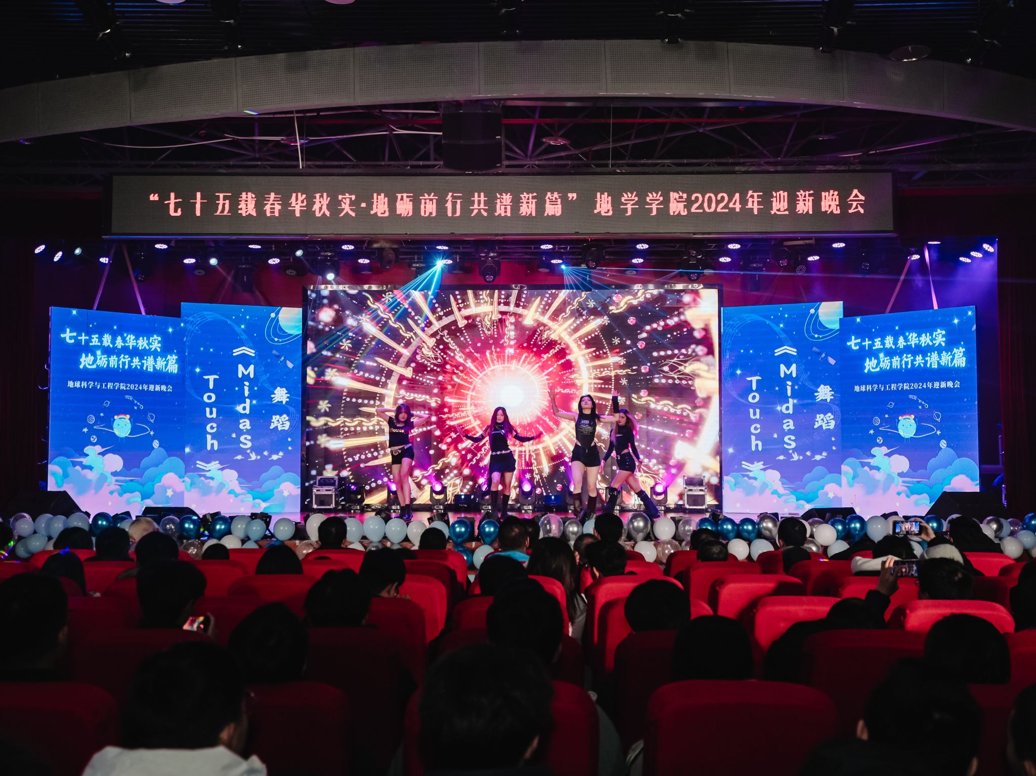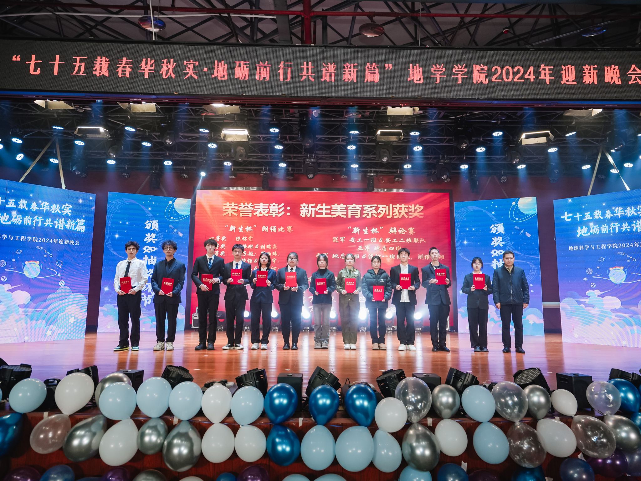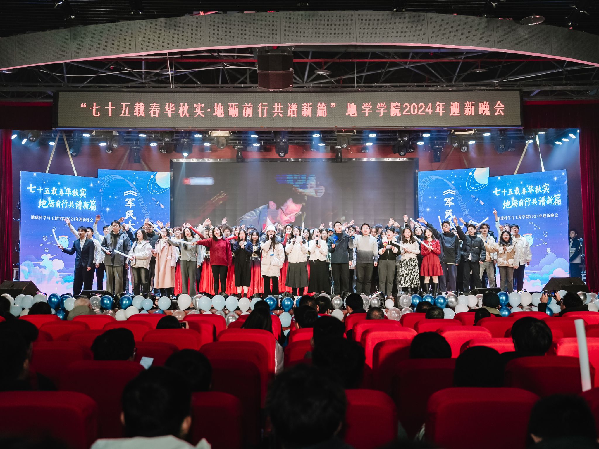 2024年迎新晚会在犀浦校区二食堂三楼大学生活动中心隆重举行。地学学院党委书记关秦川、院长刘国祥、副院长朱军,茅以升学院党总支副书记杨宏毅,地学学院党委副书记郑波,学院人才、外籍教师、专业教师、管理人员等代表,以及学院全体辅导员老师、兄弟学院学生会代表出席了本次晚会。