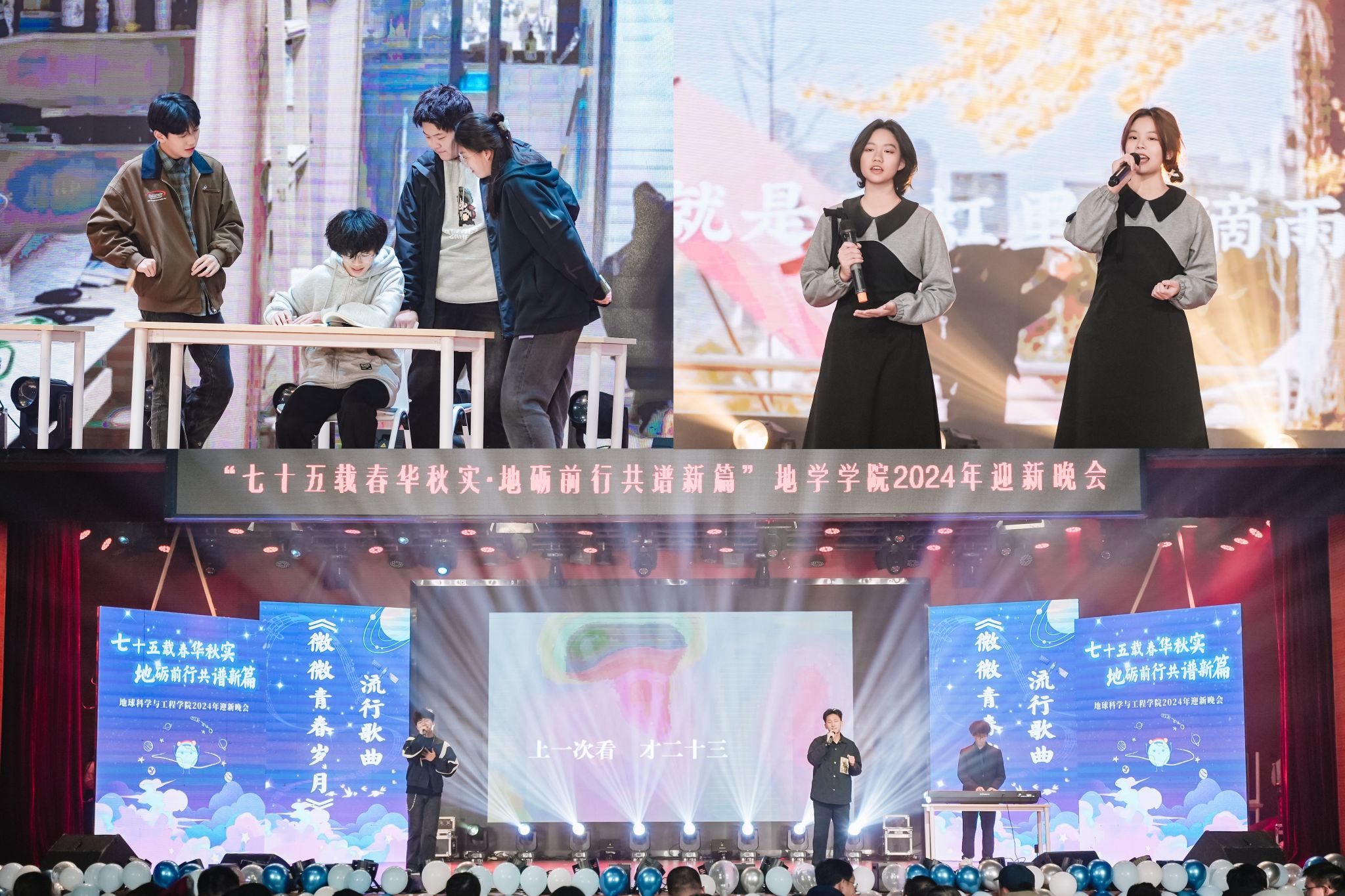 地质3班带来的小品《小抄》用贴近生活的剧情与幽默的表现形式展现“诚信”与“诱惑”,博得观众笑声的同时告诉同学们“宁可挂科,不能作弊”的道理。歌曲《微微青春岁月》将流行歌曲《才二十三》与《微微》结合,以追忆的视角带着我们回望往昔并展望美好未来。清扬的琴声伴着歌者优美的歌声,使台下的听众不由自主地挥舞起手中的荧光棒。