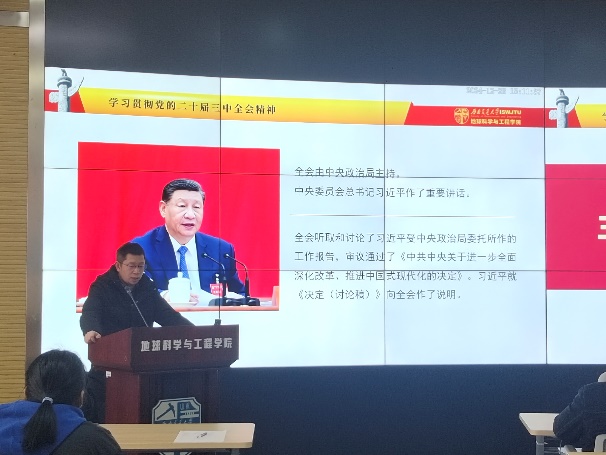 为深入贯彻党的二十届三中全会精神,提高党员理论素质与党性修养,12月26日地学学院党委委员、副院长张玉春同志在X4243为教工消防党支部、本科安全党支部、本科消防党支部讲授“三中全会·领会实质·学以致用”主题党课。
