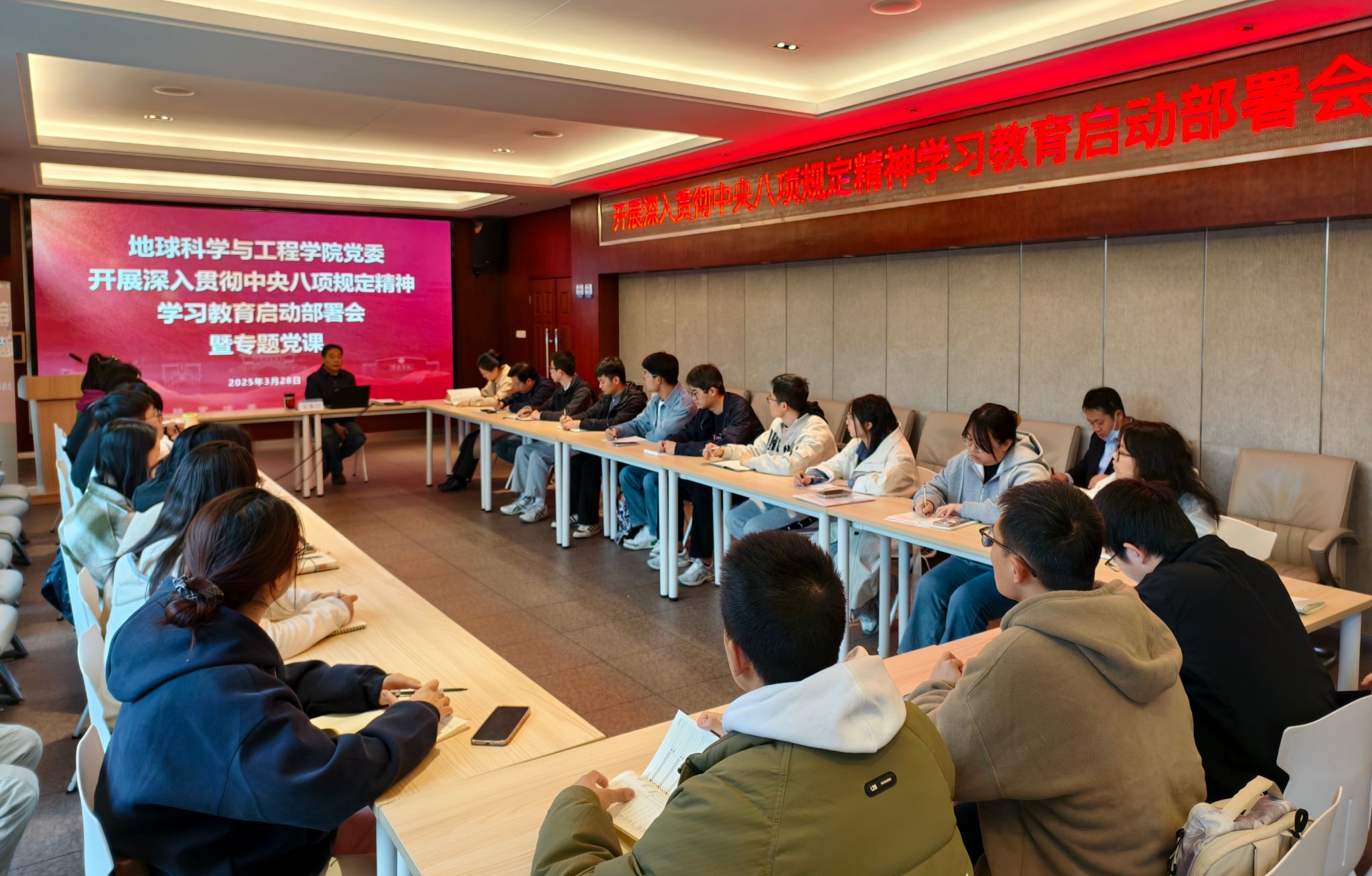 2025年3月28日,为贯彻落实党的二十届三中全会部署,锲而不舍落实中央八项规定精神,推进作风建设常态化长效化,认真贯彻落实党中央、教育部党组、学校党委关于深入贯彻中央八项规定精神学习教育的有关要求,地学学院党委在X4520会议室召开深入贯彻中央八项规定精神学习教育启动部署会暨专题党课,此次大会由学院专职组织员李晓宇主持,学院党委书记关秦川主讲,学院全体教工、学生党支部书记参与此次会议。