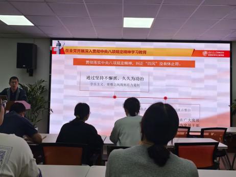 张玉春同志首先由徙木立信的故事引出本次的学习内容:在全党开展深入贯彻中央八项规定精神学习教育。随后介绍了本次学习教育的目的,要求以及开展措施。然后介绍了中央八项规定和中央八项规定精神的具体内容以及区别。违反中央八项规定精神问题共6大类14种表现,张玉春同志从前两大类为党员同志做出了详细说明,强调中央八项规定不是五年、十年的规定,而是长期有效的铁规矩、硬杠杠,要一以贯之。
