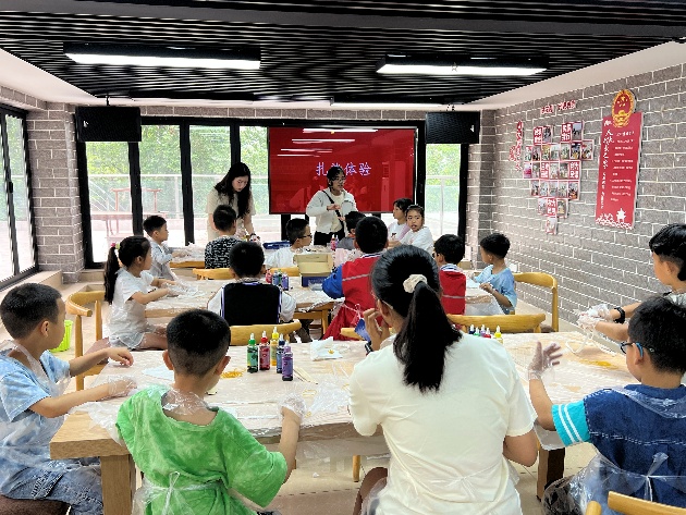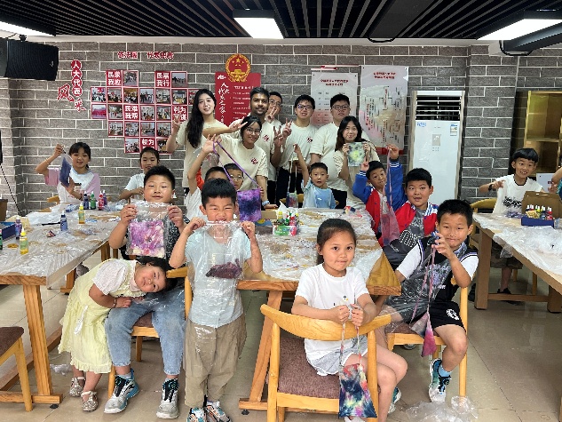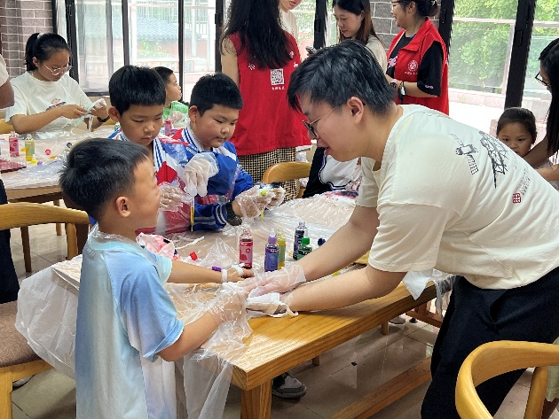 在创意手工环节,香港理工大学学生和地学学院志愿者与社区儿童结对合作,共同完成扎染和贝壳画作品。孩子们天马行空的创意与志愿者耐心的指导相映成趣。一幅幅色彩斑斓的作品不仅展现了童真,更凝聚了两地青年的协作精神。香港理工大学的陈同学感慨道:“孩子们教会我用更简单的视角看世界,这种双向的成长令人难忘。”