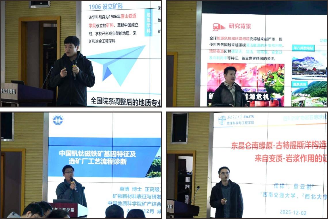 张云辉副教授作了题为“青藏高原深大断裂带地热成因研究进展”的学术报告,重点阐述了地热流体的地球化学特征与数值模拟方面的最新成果;中国地质科学院矿产综合利用研究所惠博正高级工程师以“中国钒钛磁铁矿基因特征及选矿厂工艺流程诊断”为题,从研究背景、矿石基因特征及工艺流程诊断案例等方面展开,研究内容前沿、方法丰富,并对未来合作方向进行了展望;JVID