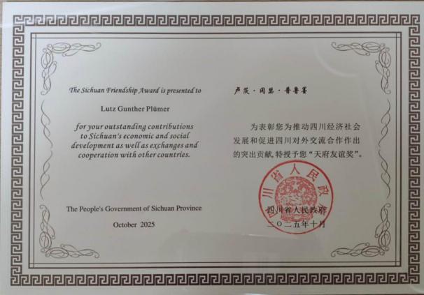 本年度四川省共有5位外国专家获此表彰。自设立以来,“天府友谊奖”已累计授予100余位来自全球各地的优秀外国专家。Lutz Plümer教授获此荣誉,是对他在校工作贡献的高度认可,也是对JVID