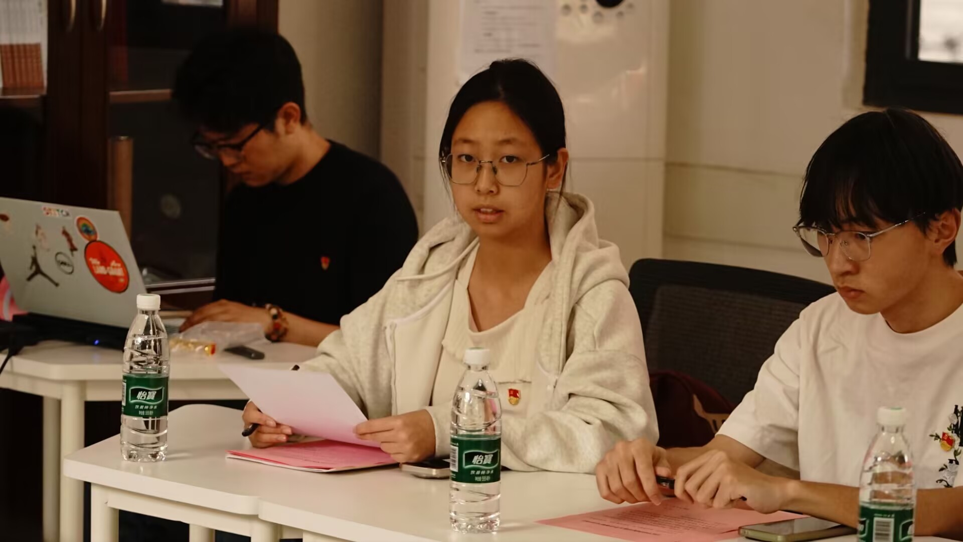 随后,曾洁老师、何梦超老师及学院学工组老师来到学生宿舍区,为首批党员先锋宿舍代表逐一悬挂“党员先锋宿舍”标识牌。鲜红的标识牌醒目亮眼,既彰显着党员的光荣身份,也承载着示范引领、服务同学的郑重责任,标志着地学学院党员先锋宿舍创建工作从倡议部署正式转入落地践行阶段。