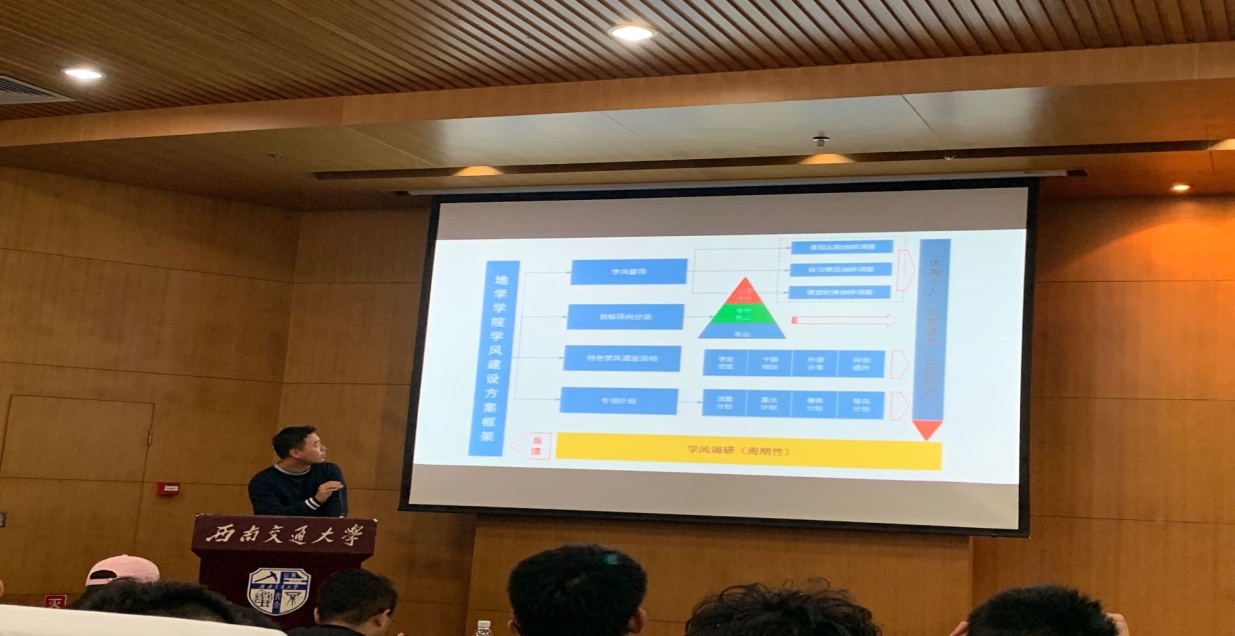11月1号下午,地学学院于图书馆一号报告厅开展学风建设月启动仪式。参加本次开幕式的有,地学学院党委副书记傅尤刚、院团委书记周青,全体辅导员老师以及2019级全体学生。大会由何杨主持。