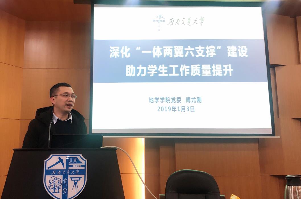 傅尤刚进行学生工作情况汇报、学院纪委工作汇报与个人述职。以《深化“一体两翼六支撑”建设助力学生工作质量提升》为题目,从学院学生工作指导思想、学生基本情况、学生工作基本思路、2018年主要工作等四个方面做学生工作情况汇报。以《狠抓学习贯彻 强化宣传教育 为学院中心工作保驾护航》为题目,做学院纪委工作汇报。