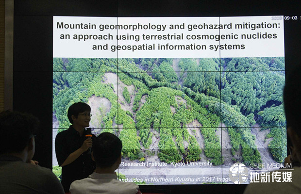随后,松四雄骑对受邀来到地学学院进行交流表示感谢,并就最新的研究进展向在场的老师同学,做了题为“山地地貌演化与地质灾害防治:一种利用陆地宇宙核素和地理空间信息系统的方法”专题报告。松四雄骑从“山地地貌和宇宙核素的新范式”讲起,通过对“加速器质谱法”等方法介绍向在场师生讲解了日本山地剥蚀量量化的方法。随后,松四雄骑介绍了分析预测降雨诱发型浅层滑坡的方法,并通过对鹿港具体示例的分析进行详细讲解。最后,针对报告内容,地学学院师生同松四雄骑展开了热烈交流。