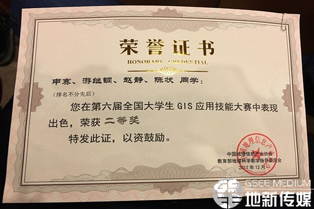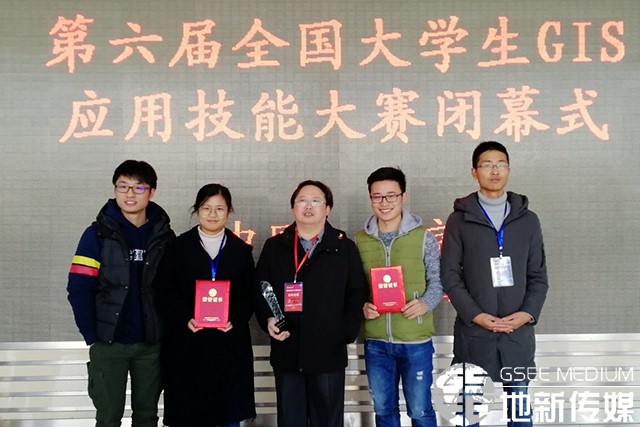 地学学院由测绘遥感信息系杨骏老师指导,四位同学申赛,游继钢,陈状,赵静组成的队伍荣获国家二等奖。