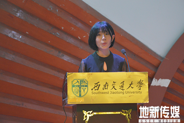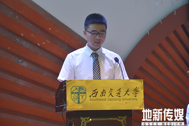 优秀学生代表学生会主席2015级地质工程系学生郝建龙发言。作为学长,郝建龙同学首先代表所有学长学姐们对新同学的到来表示热烈的欢迎。两年前郝建龙也和大家一样怀揣着美好的憧憬来到地学学院,两年后,告别懵懂和稚气,多了几分成熟与坚定。作为一个“前辈”结合自己的亲身经历,给新生们几点建议:正当好年华,大学的首要任务还是学习;充分利用学校和学院优质的平台,全方位培养自己能力;在这个机遇与挑战并存的时代,大家要敢于亮剑,敢于攀登高峰。最后祝福学弟学妹们都有美好未来,耐住寂寞,经起繁华。