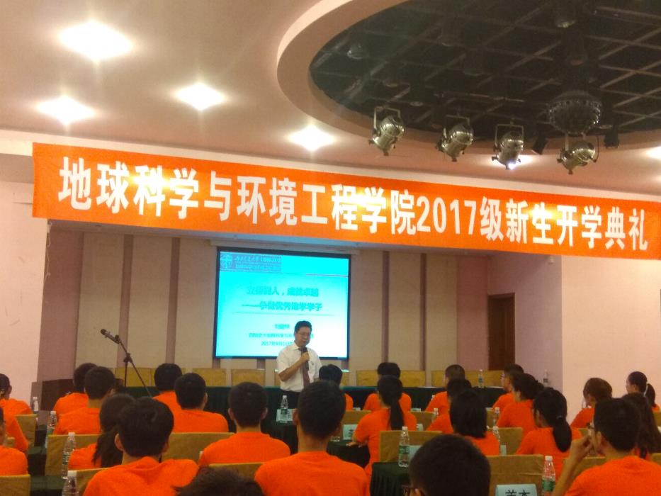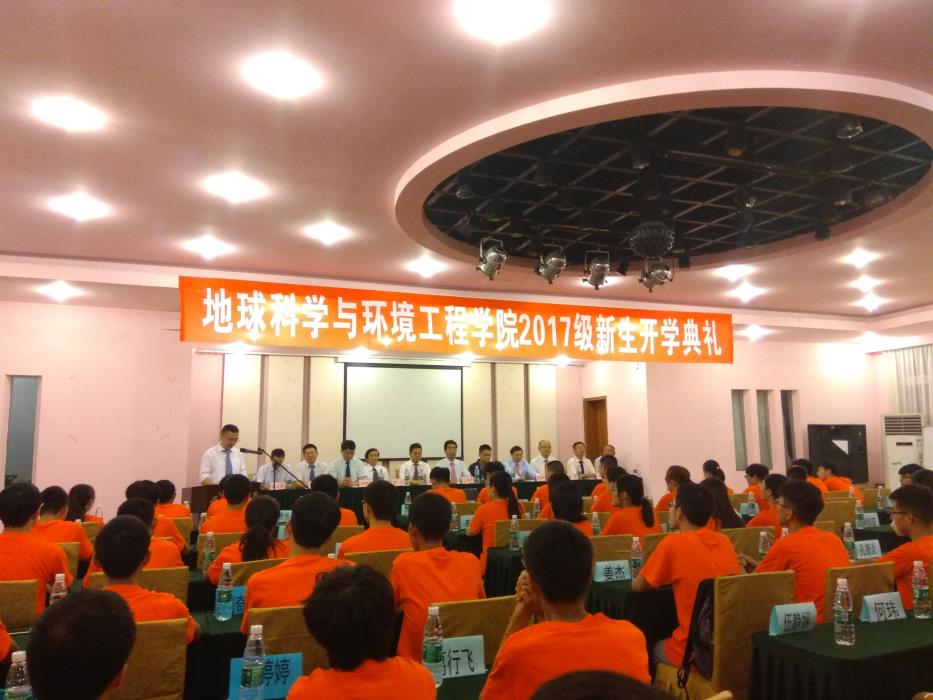 9月1日,地球科学与环境工程学院2017级新生开学典礼在峨眉校区湖山宾馆顺利召开,参加开学典礼的有地学学院院长刘国祥,院党委书记王齐荣,副院长胡卸文,副院长欧阳峰,副院长齐华,SWJTU-OSU联合办学安全工程项目主管刘丹教授,高速铁路运营安全空间信息技术国家地方联合工程实验室车伟主任,院长助理陈俊敏,院长助理范美坤,以及各学科系主任,全体行政老师。参加开学典礼的学生有73位2017级本科新同学。开学典礼由院党委副书记傅尤刚主持。