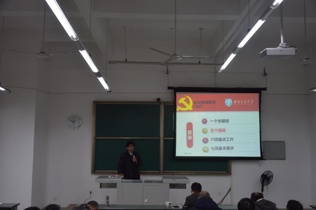 大会进行第二个阶段。首先王齐荣书记分别从一个关键词、五个强调、六项重点工作、七项基本要求四项基本内容传达学习高校思政工作会议精神。王书记重点讲到,走中国特色社会主义高等教育发展道路,要同我国发展的现实目标与未来方向紧密联系在一起,始终坚持为人民服务,为中国共产党治国理政服务,为巩固和发展中国特色社会主义制度服务,为改革开放和社会主义现代化建设服务,不能照搬、复制国外的培养模式。同时,王书记介绍了党在系班子里的重要性,要做到支部与行政工作很好地结合。关于寒假前后学院安全工作要求,王书记分别从加强安全检查和管理,层层落实工作责任、加强安全教育,强化安全意识、加强值班和信息报送工作三个方面提出了工作建议,并要求各部门按时严格落实。