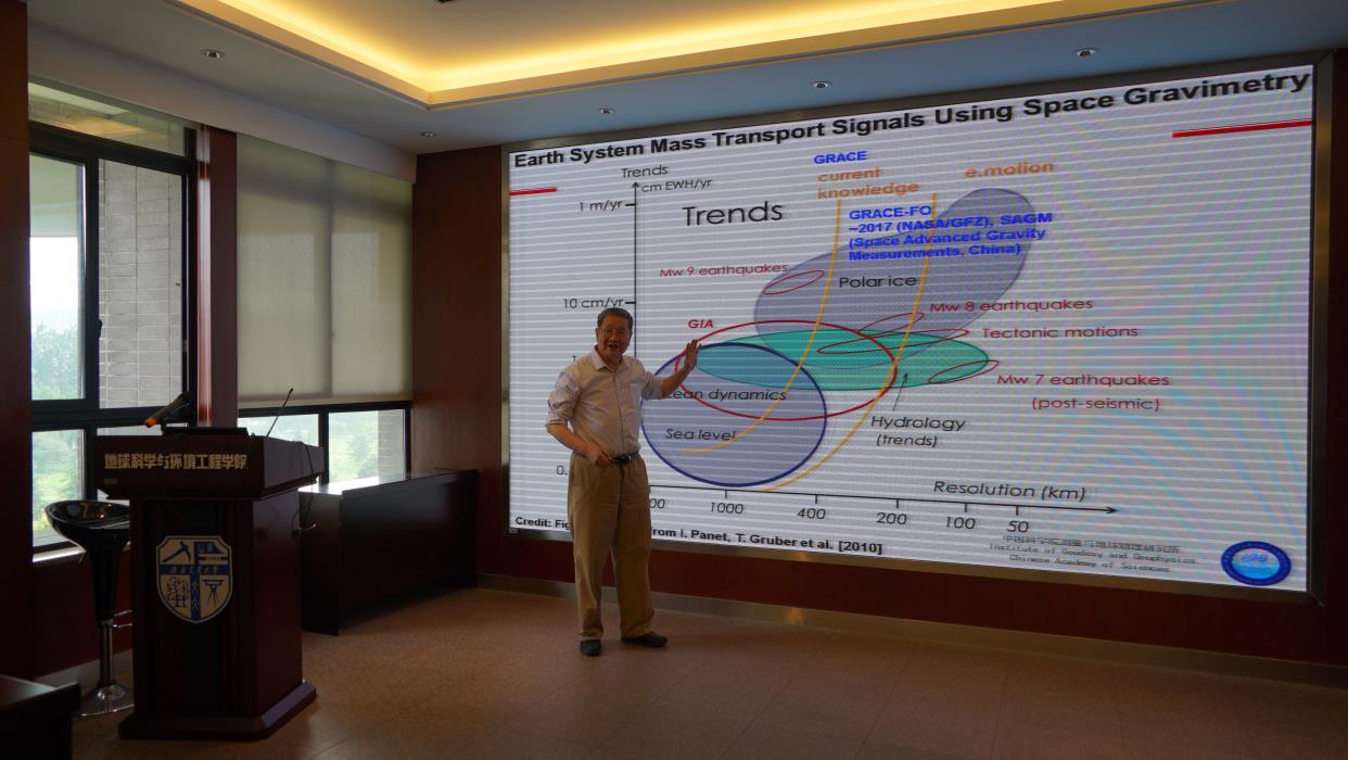 许厚泽院士做了题为《中科院测量与地球物理研究所主要科研活动》和《Satellite Gravity Mission Research in China: Progress and Outlook》的学术报告,介绍了测地所主要从事的GNSS/北斗、地震大地测量、重力、动力学及其它科研活动,也介绍了近10年来卫星重力测量的研究进展,分析了GRACE卫星的缺陷,展望了中国的卫星重力测量任务。钟敏研究员做了题为《GRACE卫星重力水文学进展与问题及下一代重力卫星计划》的报告,讲述了卫星重力的研究背景和意义、利用GRACE监测华北与东北地下水储量的变化及下一代重力卫星计划的内容。报告会持续到下午18:00,王齐荣书记、朱庆教授、范东明教授、袁林果教授、游为博士及其他大地测量方向研究生参加了此次报告会。
