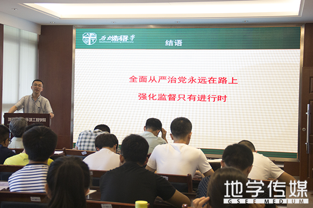 6月3日下午,地学学院党委“两学一做”专题党课之四---从新《条例》再学习看“全面从严治党”专题学习活动,于犀浦校区4520会议室如期举行。院党委副书记傅尤刚,刘冠军、冯丽梅老师以及JVID