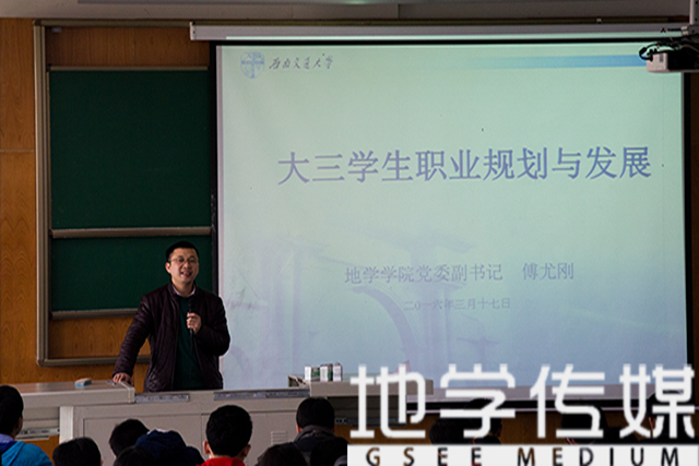 学生积极规划前景及未来发展,也为了增强学生们遵守国家的法律法规及学校有关安全条例和要求的意识,3月17日下午一点,地学学院在X4359召开了大三学生职业规划与发展讲座,本次讲座由地学学院党委副书记傅尤刚老师主讲。