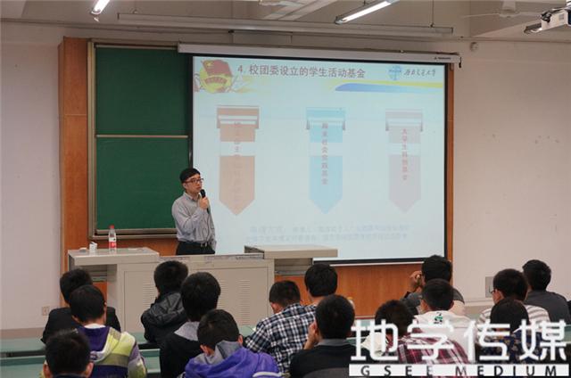 犀浦校区4359教室,校团委办公室主任王蔚老师应邀对地球科学与环境工程学院2014级新生开展入学教育。讲座内容围绕学校团委开设的各类活动和课程,旨在让新生们对学校团委以及第二课堂有一定的了解。地学学院辅导员杨都强老师及地学学院14级全体新生参加了此次讲座。