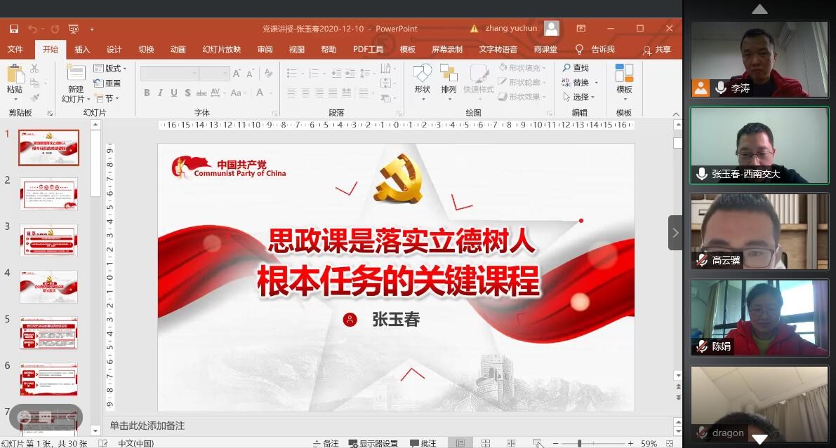 为了帮助消防工程专业教师推进专业课课程思政教学,2020年12月10日下午15:00,地学学院党委委员、副院长张玉春教授给教工消防党支部讲授了《思政课是落实立德树人根本任务的关键课程》和《专业课程融入思政工作的教学设计理念与方法》专题党课。由于受近期成都新冠疫情的影响,本次党课采用线上形式,会议平台为腾讯会议(会议ID:634 962 758),消防工程系全体教师参加了本次会议。