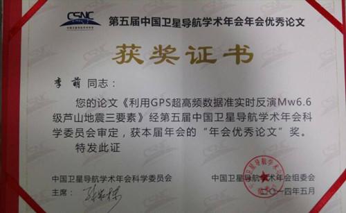 On 20th May 2014 to 23th May 2014, the doctorial student, LI Meng was awarded by the best paper "Using GPS UHF near real-time data retrieval Mw6.6 level Lushan earthquake three elements", in the Fifth China satellite navigation meeting.