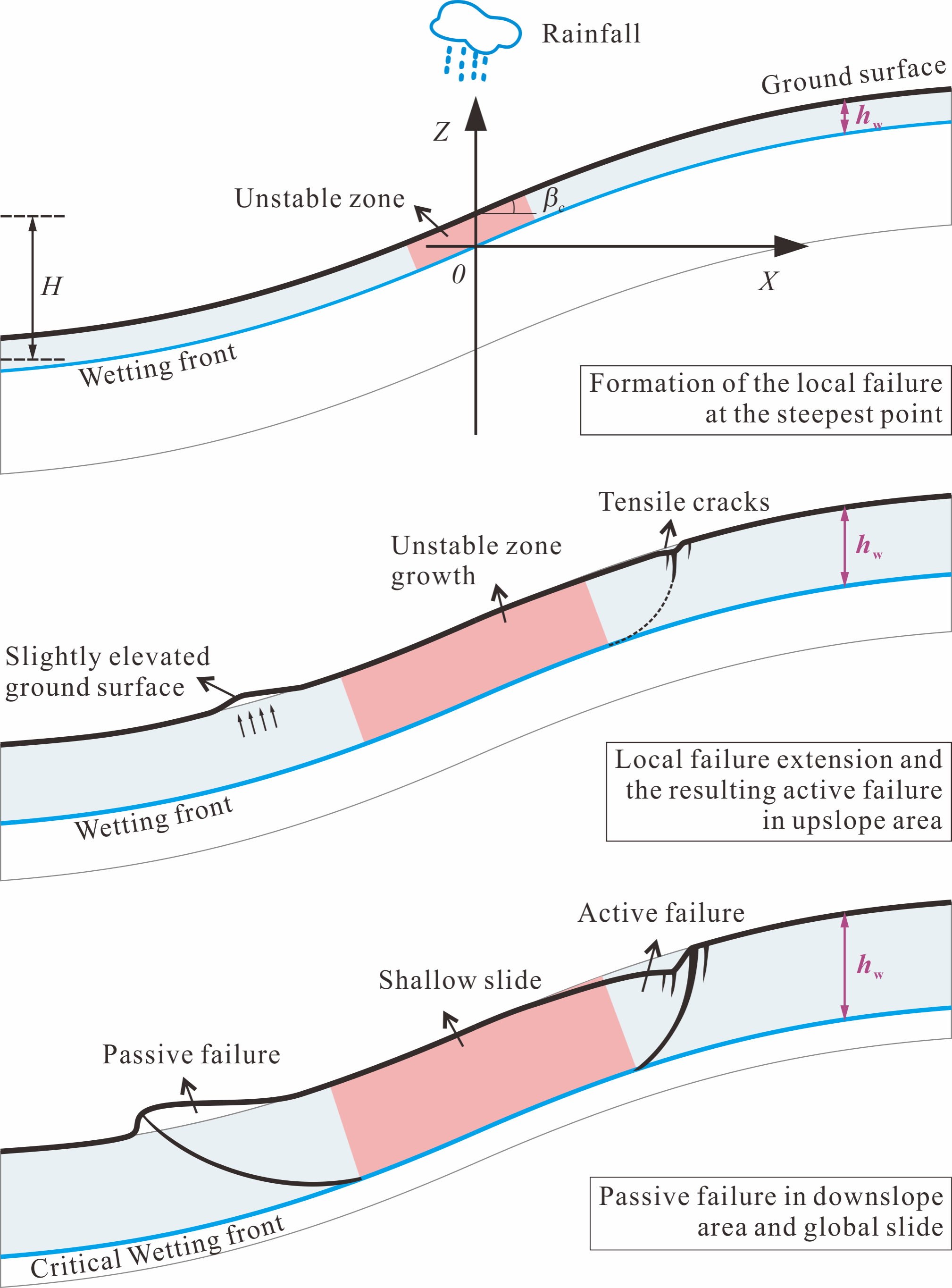 相较于直线型斜坡与简单边坡,具有非线性剖面形态的自然斜坡是降雨诱发滑坡的主要载体。因此,由于忽略了斜坡几何连续变化产生的边界效应,当前基于无限斜坡或简单边坡的评估模型在自然斜坡中的应用有限。在土体基质吸力降低与重度增加的共同作用下,自然斜坡的局部失稳往往在剖面最陡处开始,并逐渐向上下坡发展,较缓处坡体则制约着斜坡失稳的扩展范围即滑坡的规模,这一现象已在海底滑坡中得到了证明。然而,降雨入渗过程中非线性残坡积土斜坡的渐进破坏机理与失稳扩展范围仍是当前研究的空白,而对这一问题的回答是自然斜坡中降雨滑坡成功预测预报的关键。