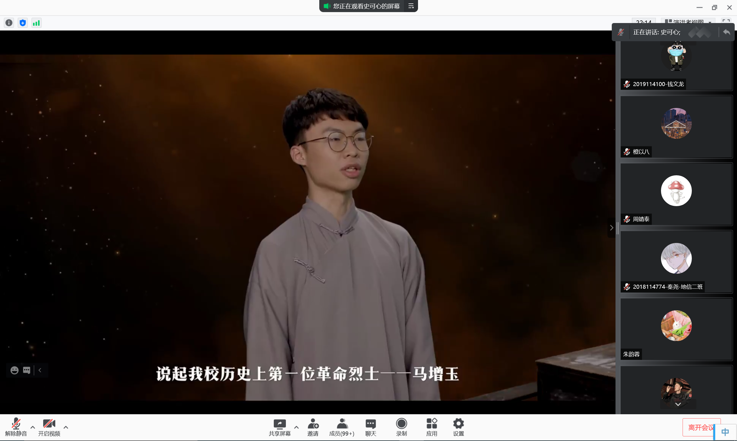 首先,史可心老师为大家介绍了“烈士纪念日”的由来及其现实意义,史可心老师强调今日之盛世离不开每一位为革命事业献身的前辈,革命烈士的每一滴鲜血都不会白流,每一种牺牲都值得我们铭记。接着史可心老师带领全体同学回顾了习近平等党和国家领导人同各界代表一起在天安门广场向人民英雄敬献花篮,缅怀革命先烈的视频,同习近平总书记一同感受天地英雄之气,其中习近平总书记的“我们一定要铭记烈士们的遗愿,永志不忘他们为之流血牺牲的伟大理想”“一寸山河一寸血,一抷热土一抷魂”等语句更是激励着全体党员、积极分子砥砺初心,奋勇前行。