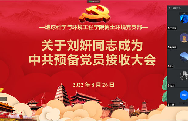 2022年8月26日下午16时00分,地学博士环境党支部在X4520教室召开预备党员接收大会。大会就发展对象刘妍同志接收为预备党员问题进行讨论。会议由党支部书记闵雪峰同志主持,支部党员及积极分子出席会议。会议通过线上与线下结合方式进行。