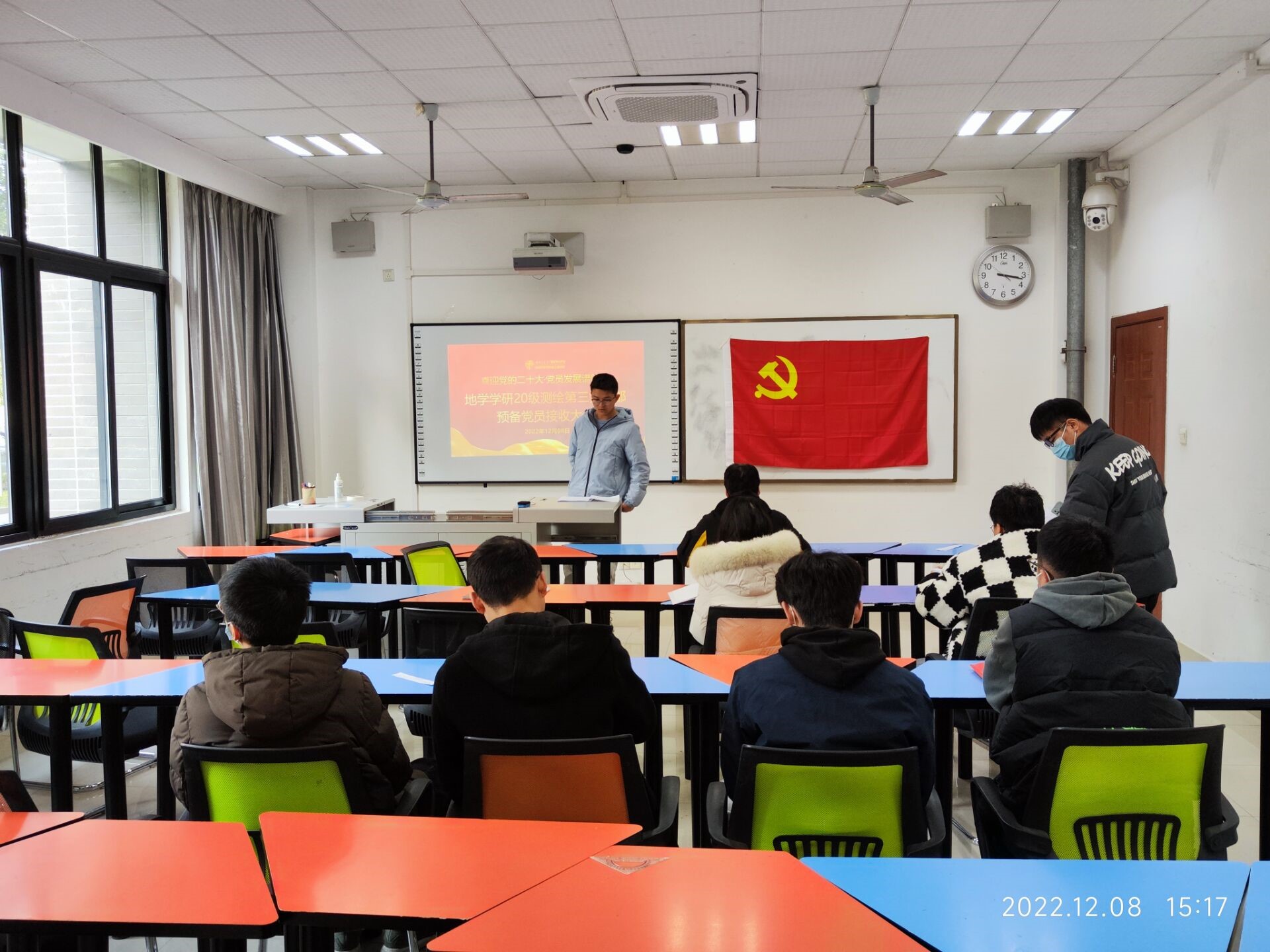 2022128日下午1500,研20级测绘第三党支部在X4131召开党员大会,会议议题为讨论关于接收谢凌霄、张展豪等两名同志为中共预备党员的问题。大会由支部书记高颖同志主持,党员和入党积极分子参加了此次会议。