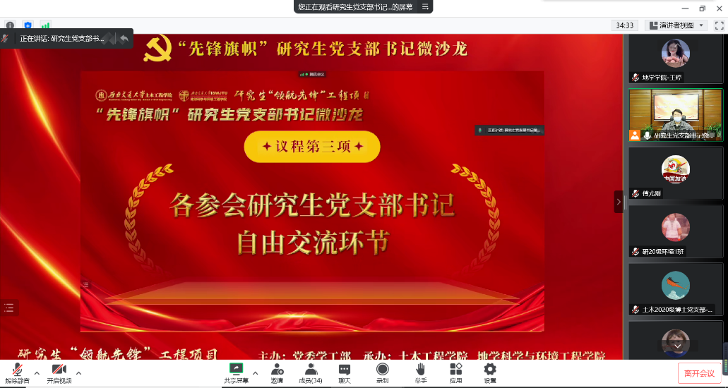 之后,各参会研究生党支部书记进行了自由交流,各党支部书记针对疫情形势下线上开展党日活动的创新性、提高支部党员参与活动的积极性等问题进行了交流学习,相互分享优秀经验,提出了党员积分制考核方法、将“专业学习”和“党建工作”相互融合等方法,在提高党日活动的吸引力的同时,也有利于筑牢党员的角色意识。