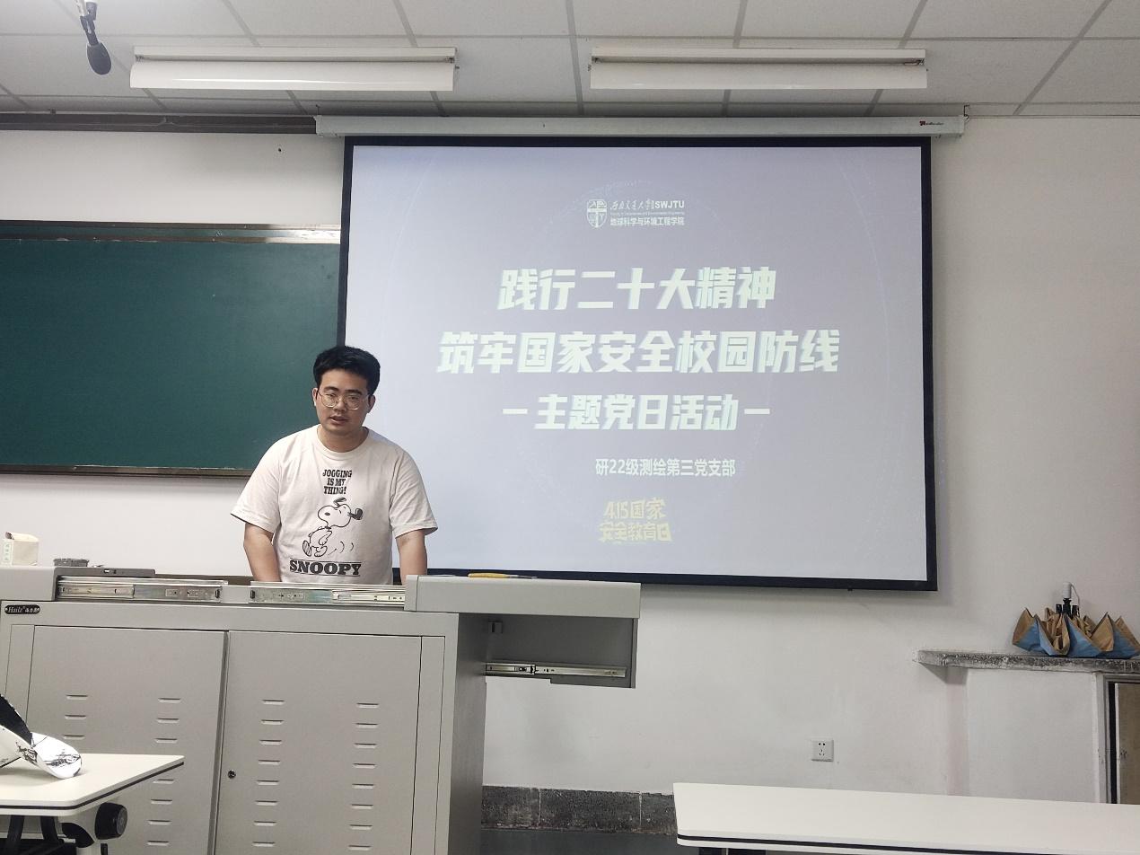 2023年5月8日19:30,地学学院研22级测绘第三党支部在J2624教室顺利召开“践行二十大精神,筑牢国家安全校园防线”主题党日活动,活动的主题是普及国家安全保密法律法规和保密知识技能,增强支部成员保护国家安全的意识,使支部成员有效掌握安全保密防范技能,牢筑保密思想防线。本次会议支部所有党员均参加,会议由党支部组织委员杨成明同志主持。