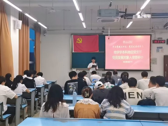 为做好2023年上半年党员发展工作,切实提高党员发展质量,地学学院本科地信党支部于2023年4月17日19:30在x2423开展了2023-01期发展对象候选人座谈会与答辩会。会议由党支部书记曾祥珂主持,党员应到28人,实到21人,以及由十三名发展对象候选人参会。