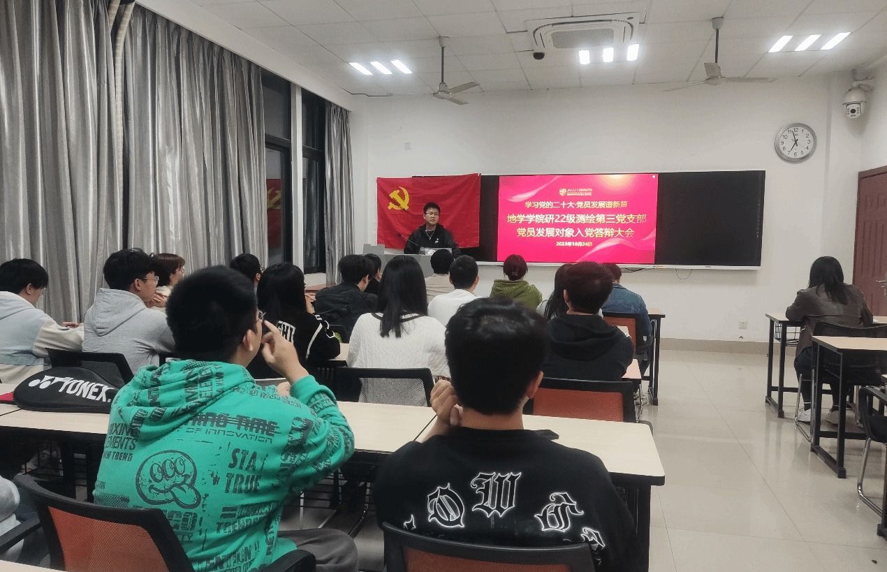 2023年10月24日19点整,地学学院研22级测绘第三党支部在X4129教室顺利召开发展对象入党答辩会,会议的主题是从吴桐同志、李炎秋同志、陈星宇同志、黄涛同志、何轲同志这五位入党积极分子中选取一位作为2023-02期发展对象。本次会议16名党员(含1名预备党员)和所有入党积极分子均参加,此外,还特别邀请辅导员李林遥老师作为政治理论考核员,考察各位候选人的政治理论学习情况。会议由党支部书记刘翔同志主持。