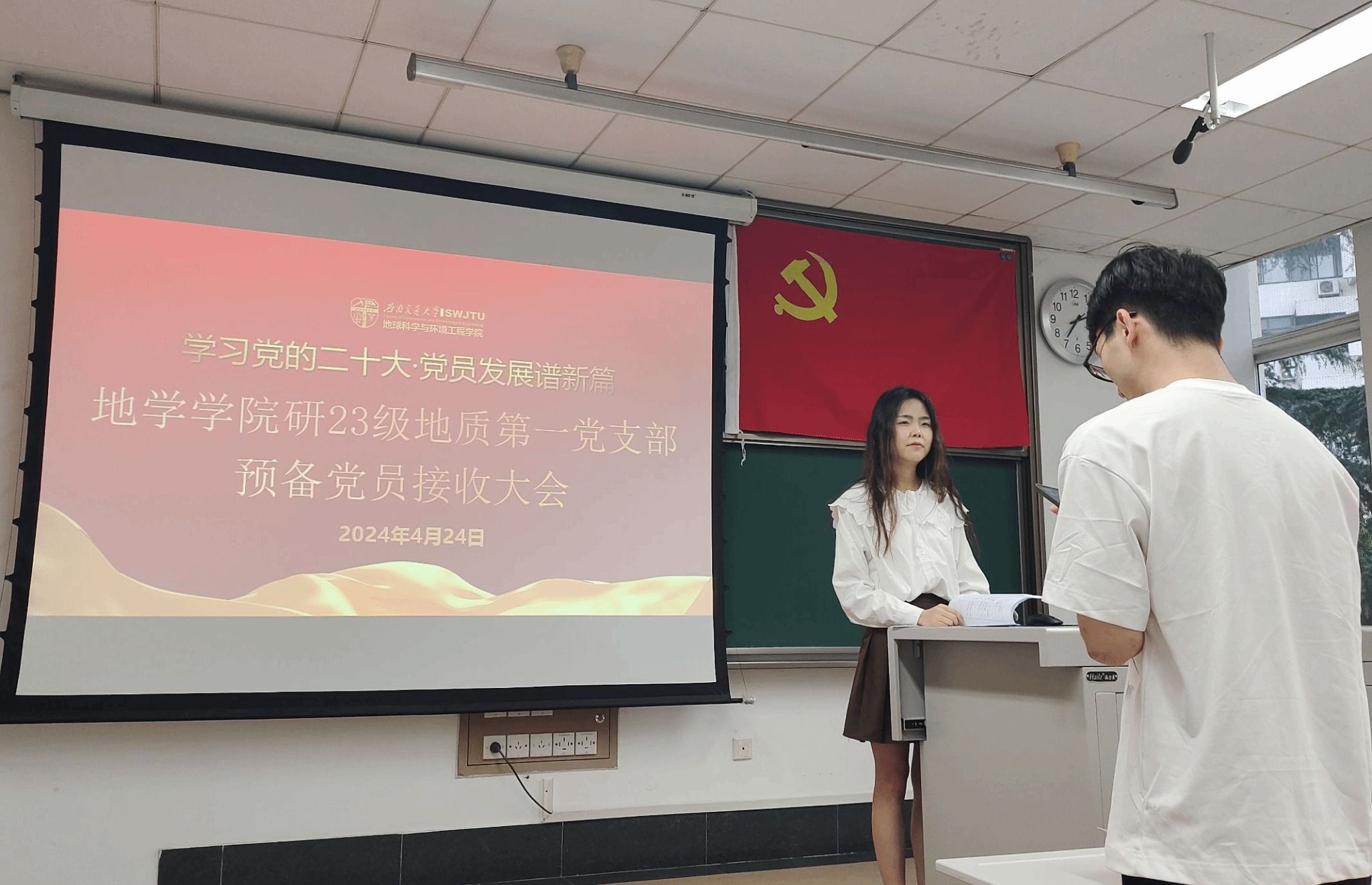 为做好2024年发展党员工作,切实提高党员发展质量。研23级地质第一党支部于2024年4月24日19:00在J4221召开2024-01期预备党员接收大会,本次会议由党支部书记张雨晴同志主持,支部党员、发展对象、入党积极分子和入党申请人总计17人与会。