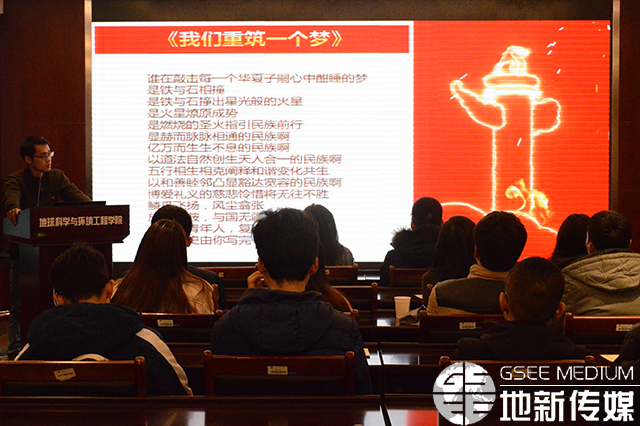 12月21日,由地学学院党建事务中心主办,本科14级测绘茅以升班党支部、本科15级第二党支部承办的“由青春遇上十九大,创意展现新思想”作品征集活动及“书写十九大”书法征集活动颁奖典礼于x4520举行。2014级本科生辅导员杨都强、2017级本科生辅导员海迪拉参加典礼。
